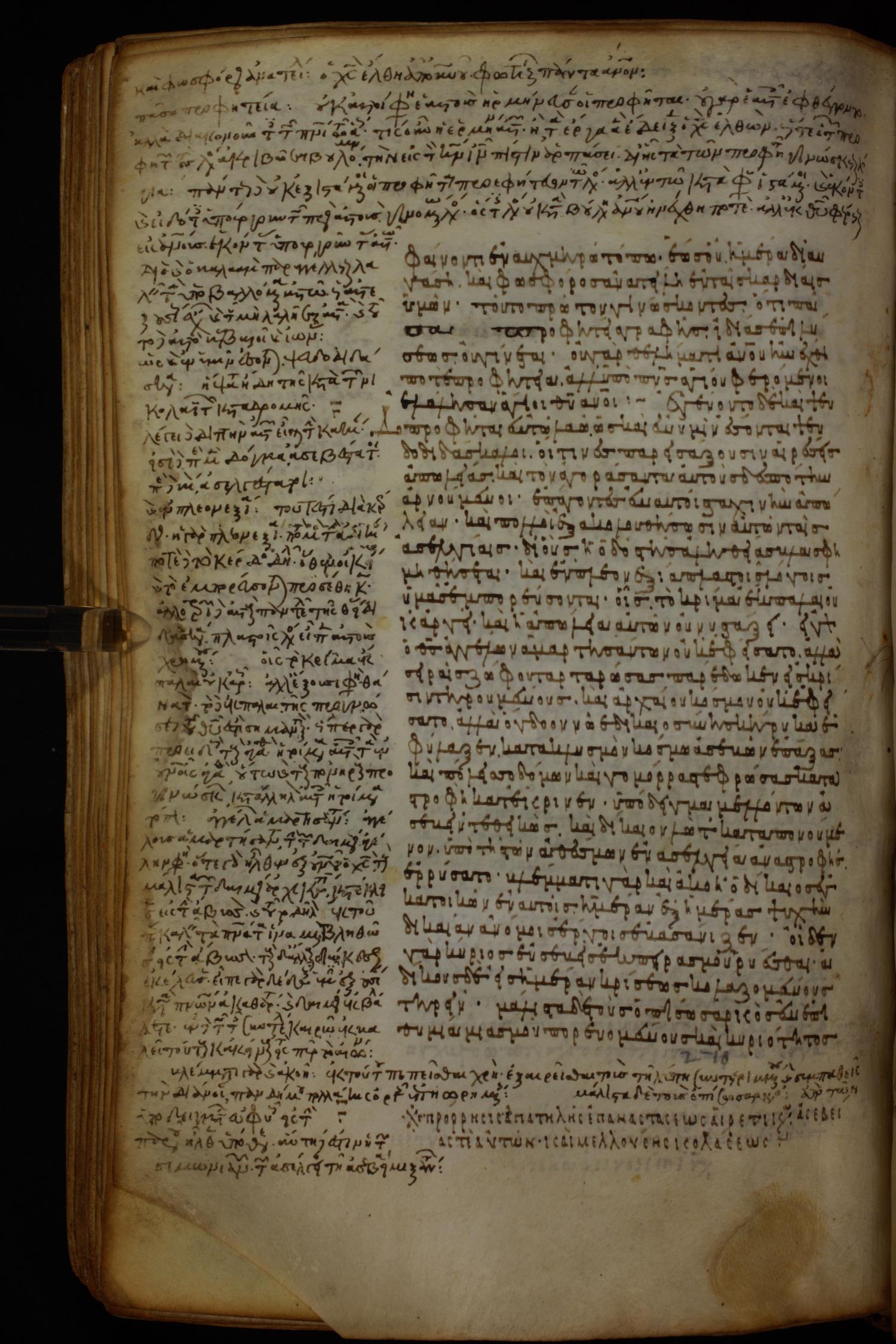 Ninth or tenth century minuscule of the Gospels, Apostolos, Paul, and Revelation (complete New Testament) with commentary on parchment; 337 leaves, single column, 29–33 lines per column.