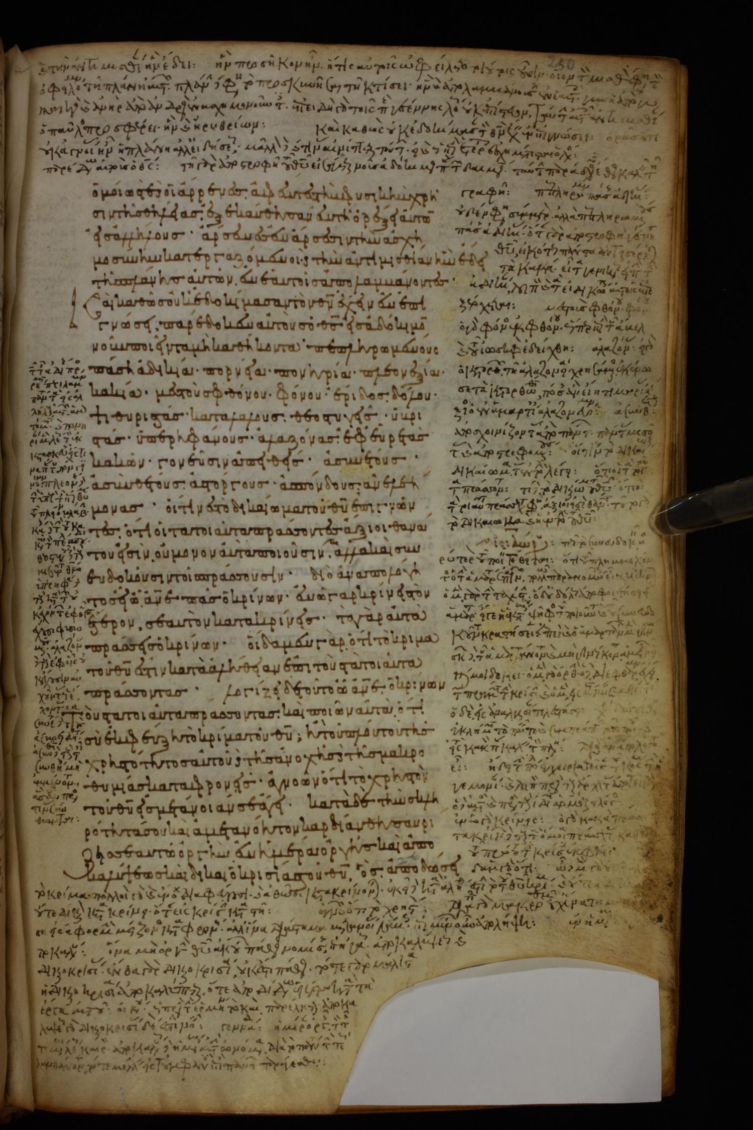 Ninth or tenth century minuscule of the Gospels, Apostolos, Paul, and Revelation (complete New Testament) with commentary on parchment; 337 leaves, single column, 29–33 lines per column.
