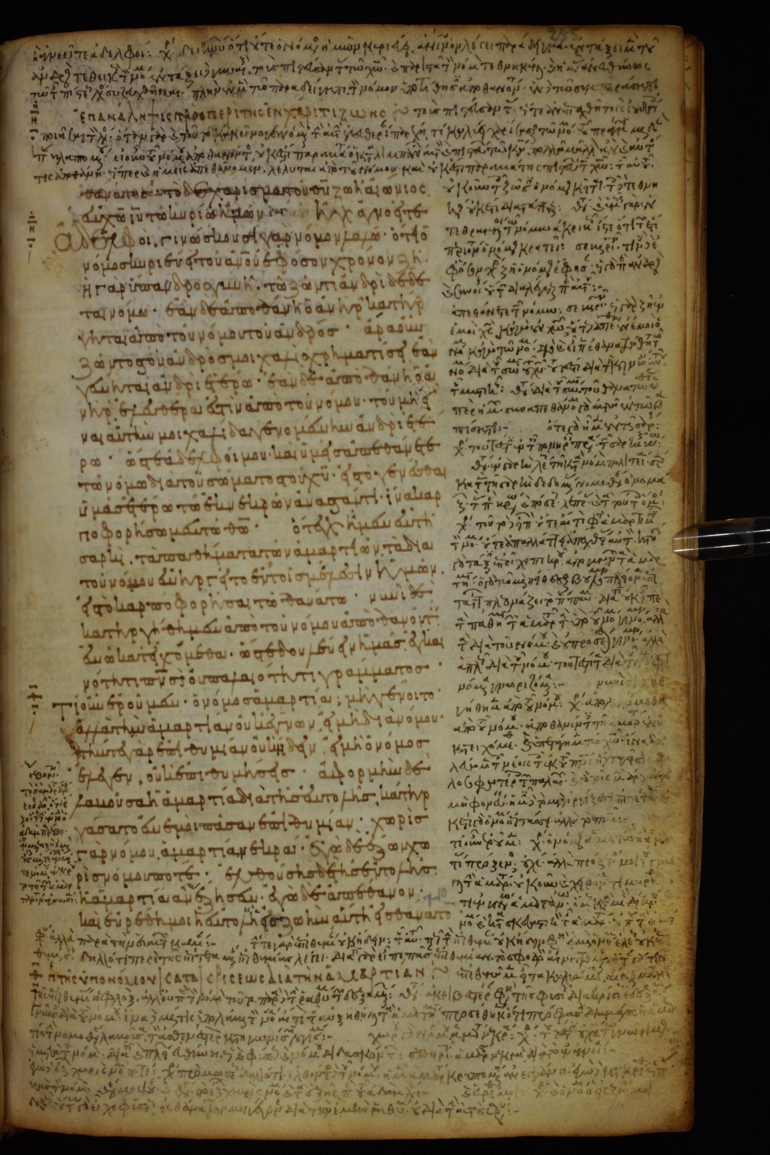 Ninth or tenth century minuscule of the Gospels, Apostolos, Paul, and Revelation (complete New Testament) with commentary on parchment; 337 leaves, single column, 29–33 lines per column.