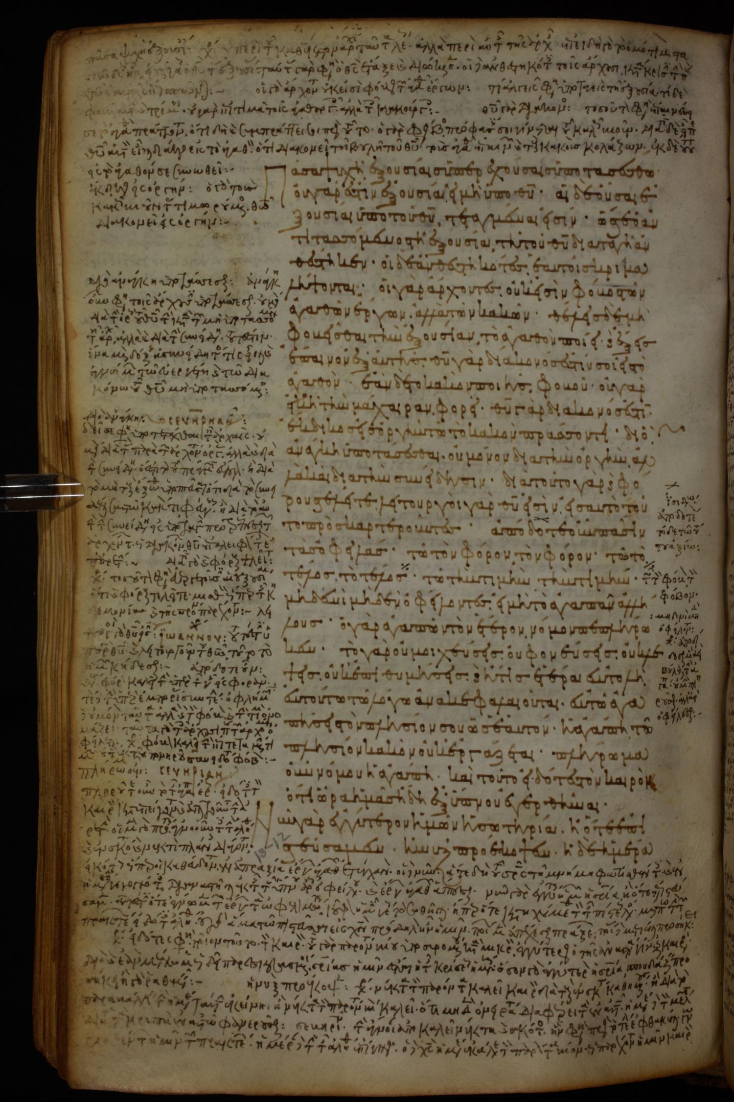 Ninth or tenth century minuscule of the Gospels, Apostolos, Paul, and Revelation (complete New Testament) with commentary on parchment; 337 leaves, single column, 29–33 lines per column.