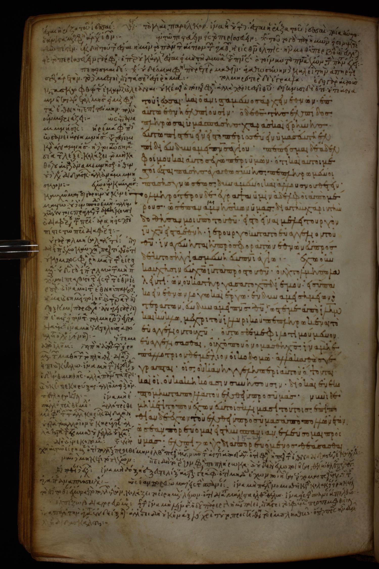 Ninth or tenth century minuscule of the Gospels, Apostolos, Paul, and Revelation (complete New Testament) with commentary on parchment; 337 leaves, single column, 29–33 lines per column.