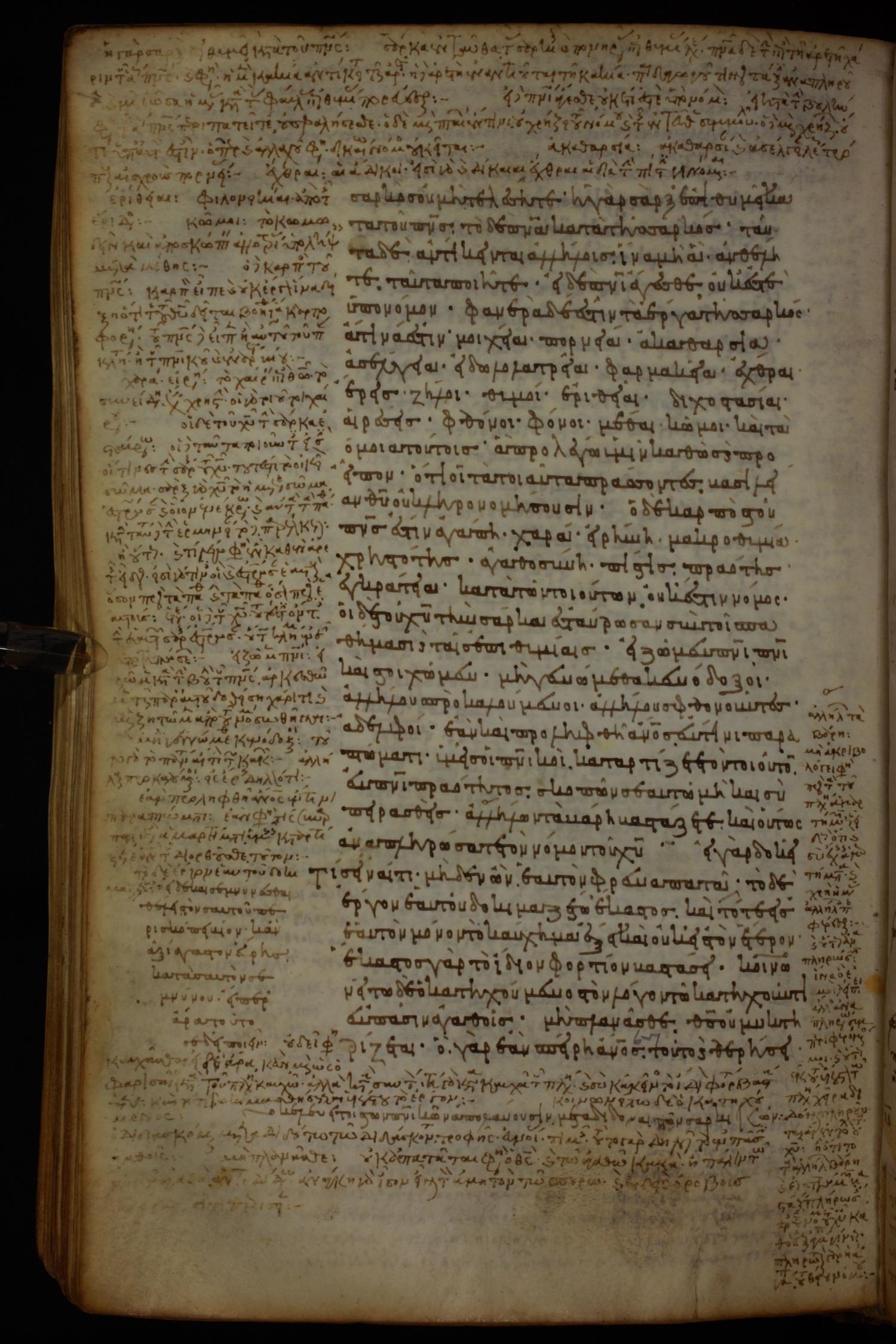 Ninth or tenth century minuscule of the Gospels, Apostolos, Paul, and Revelation (complete New Testament) with commentary on parchment; 337 leaves, single column, 29–33 lines per column.
