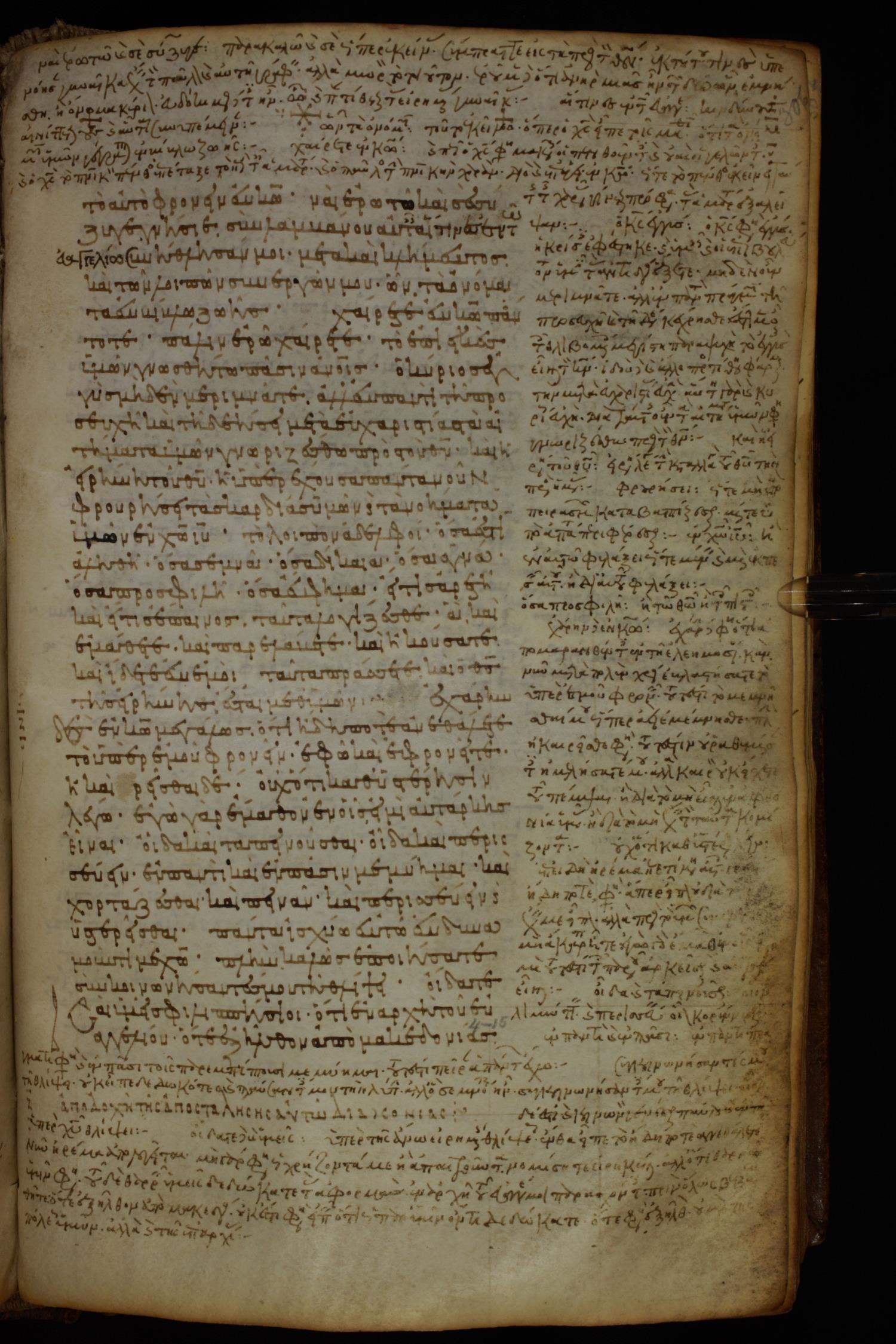 Ninth or tenth century minuscule of the Gospels, Apostolos, Paul, and Revelation (complete New Testament) with commentary on parchment; 337 leaves, single column, 29–33 lines per column.