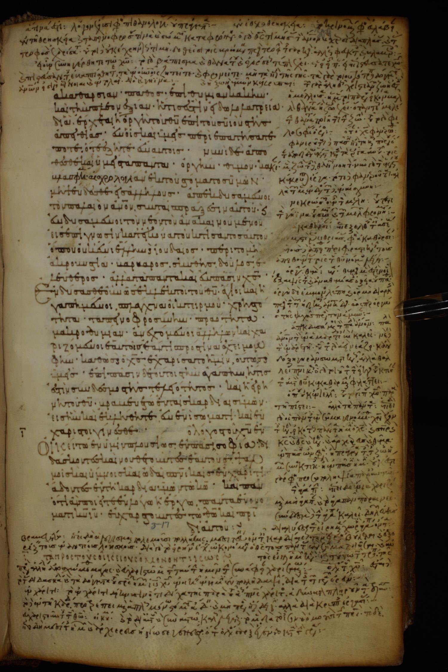 Ninth or tenth century minuscule of the Gospels, Apostolos, Paul, and Revelation (complete New Testament) with commentary on parchment; 337 leaves, single column, 29–33 lines per column.