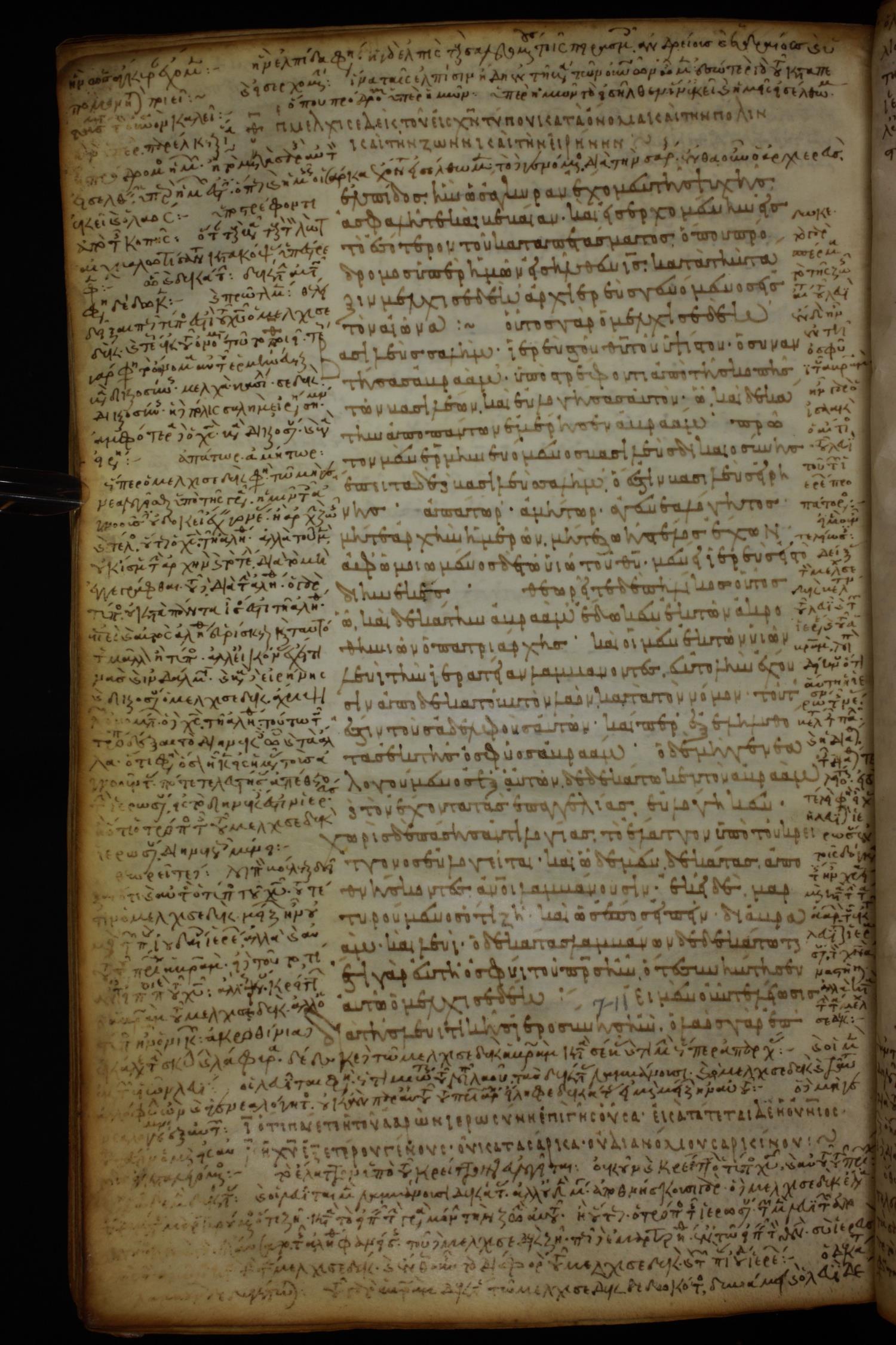 Ninth or tenth century minuscule of the Gospels, Apostolos, Paul, and Revelation (complete New Testament) with commentary on parchment; 337 leaves, single column, 29–33 lines per column.
