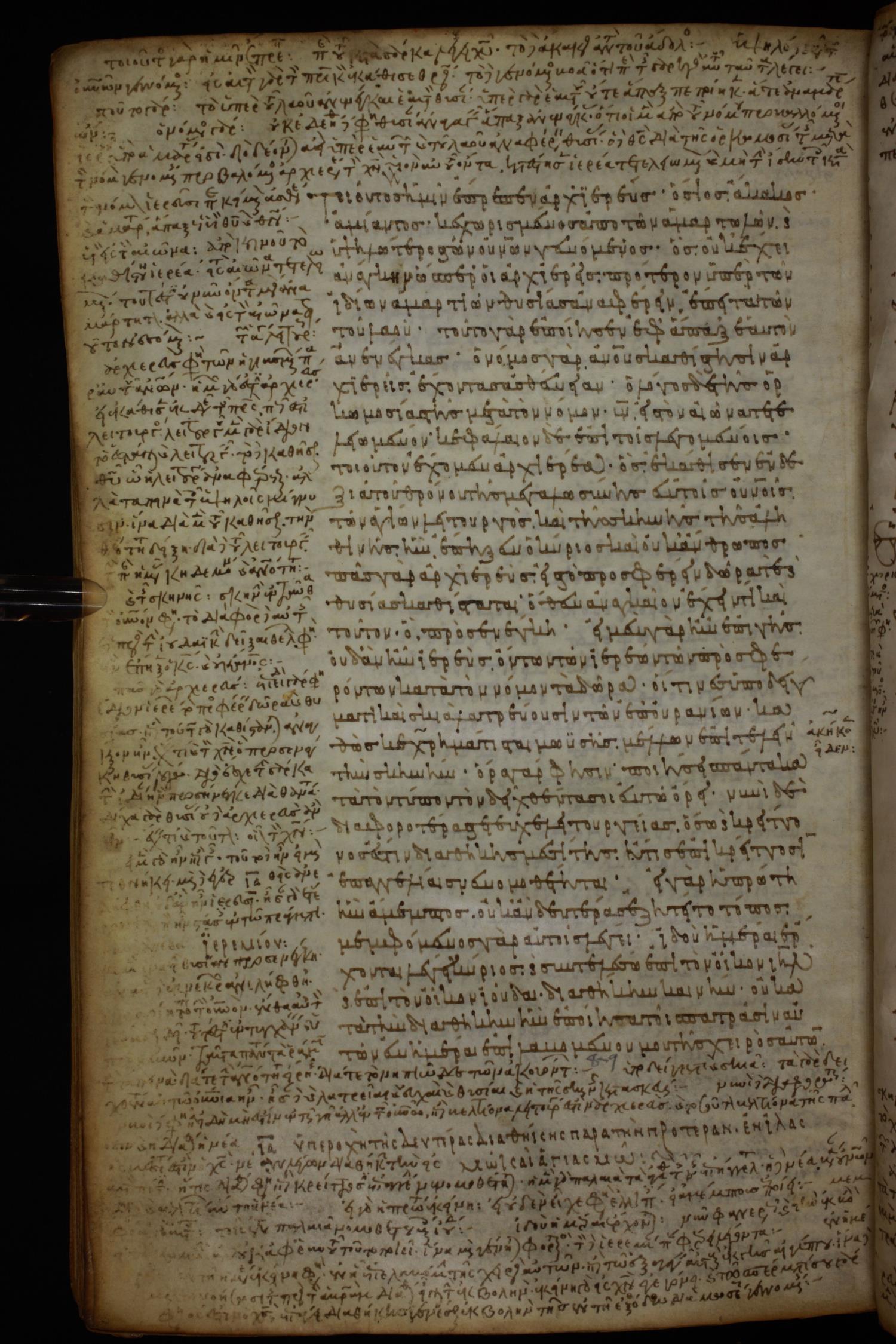Ninth or tenth century minuscule of the Gospels, Apostolos, Paul, and Revelation (complete New Testament) with commentary on parchment; 337 leaves, single column, 29–33 lines per column.