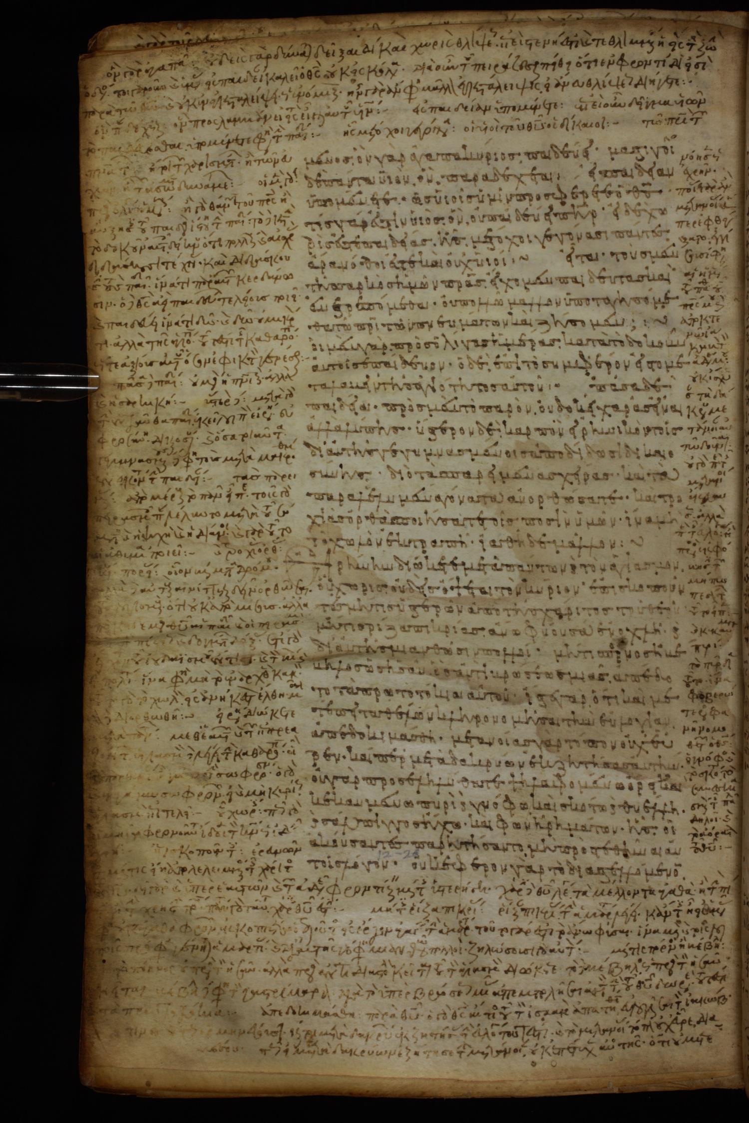 Ninth or tenth century minuscule of the Gospels, Apostolos, Paul, and Revelation (complete New Testament) with commentary on parchment; 337 leaves, single column, 29–33 lines per column.