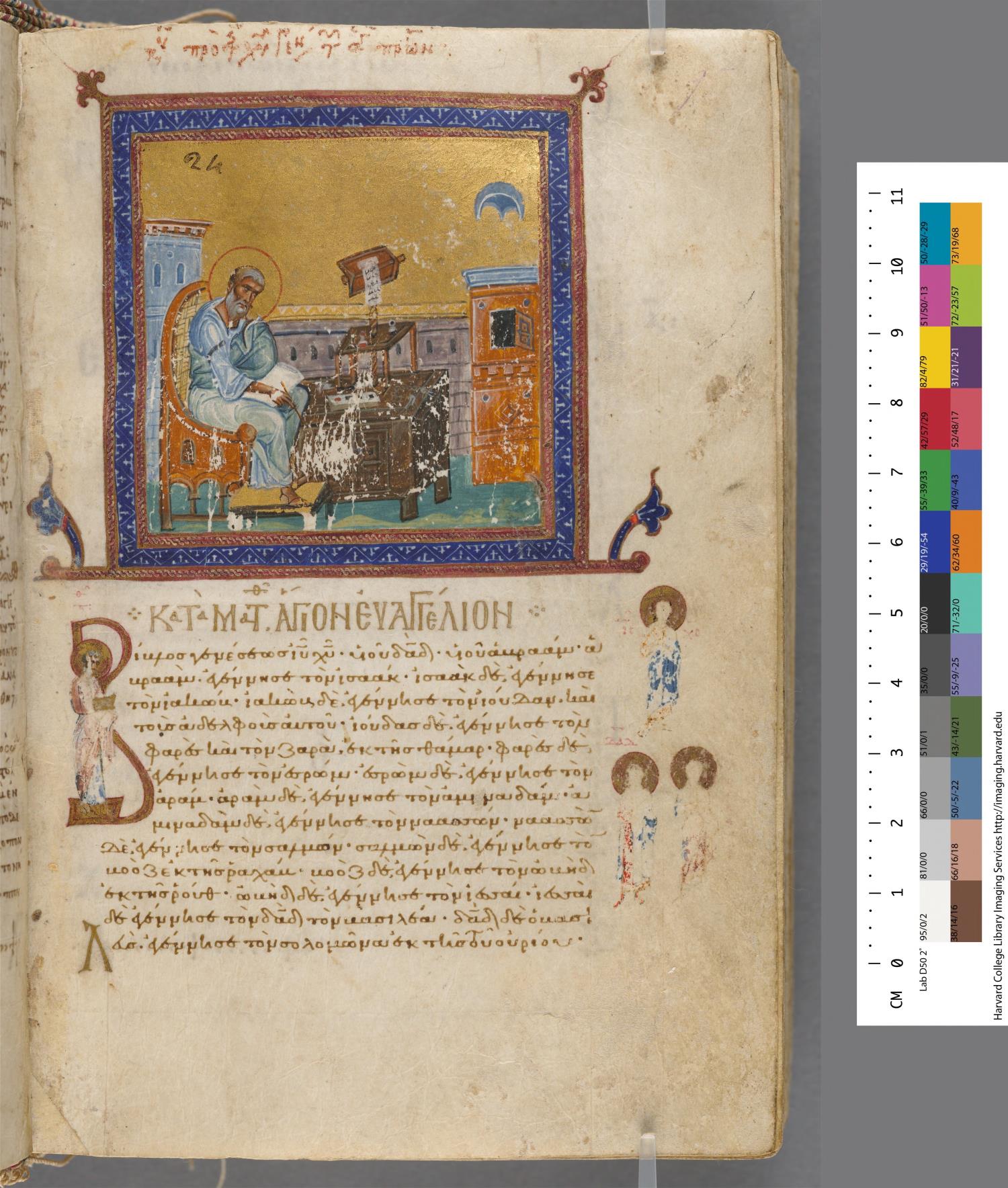 Eleventh-century minuscule on parchment containing the Gospels, Acts, and Paul. 255 leaves (253 at Dumbarton Oaks); 1 column; 36 lines per column. These images are made available by the Harvard University Dumbarton Oaks Repository according to Creative Commons.