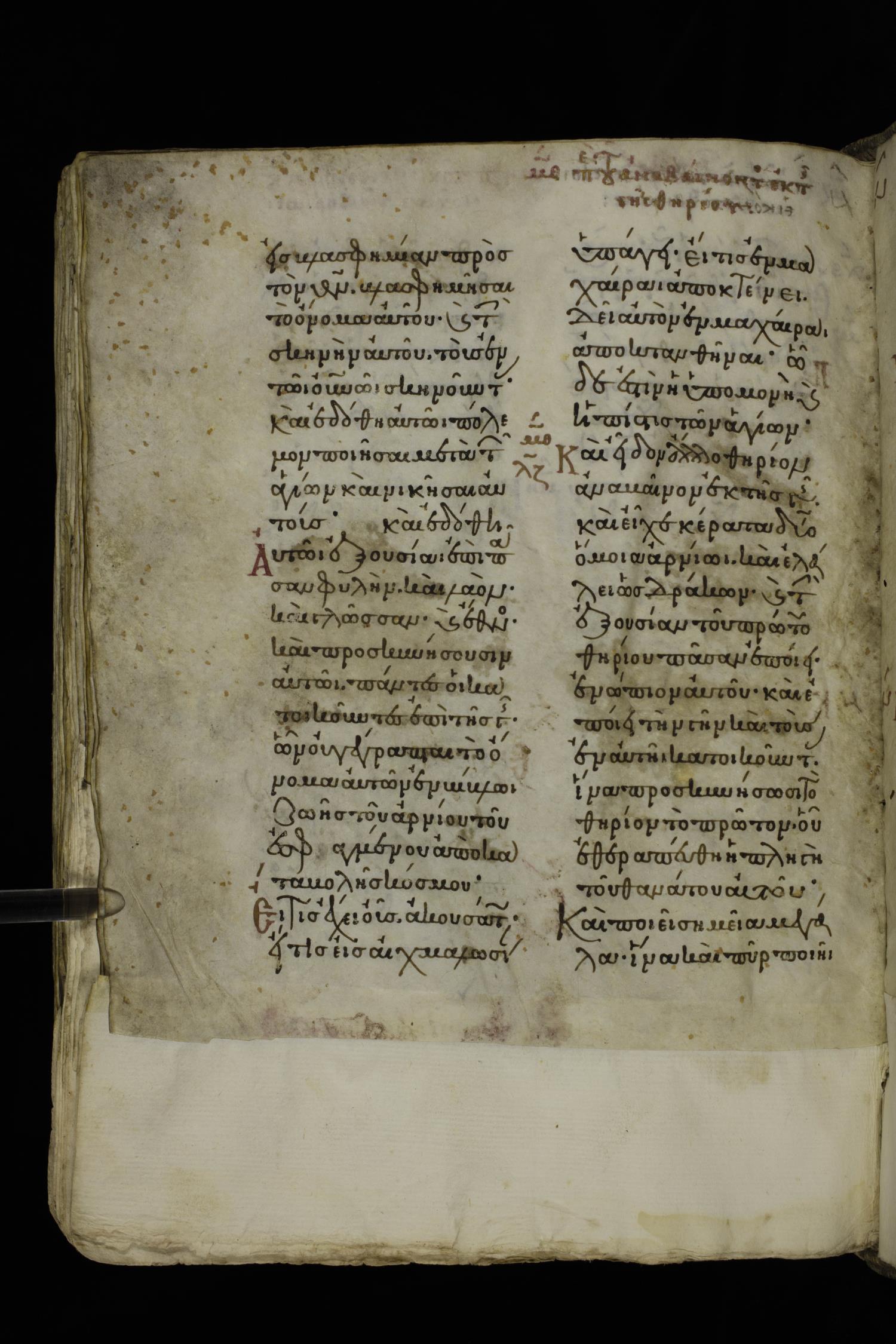 Tenth century minuscule of the Apostolos, Paul, and Revelation on parchment; 312 leaves, 2 columns, 22 lines per column. Images were taken at the National Library of Greece in Athens.