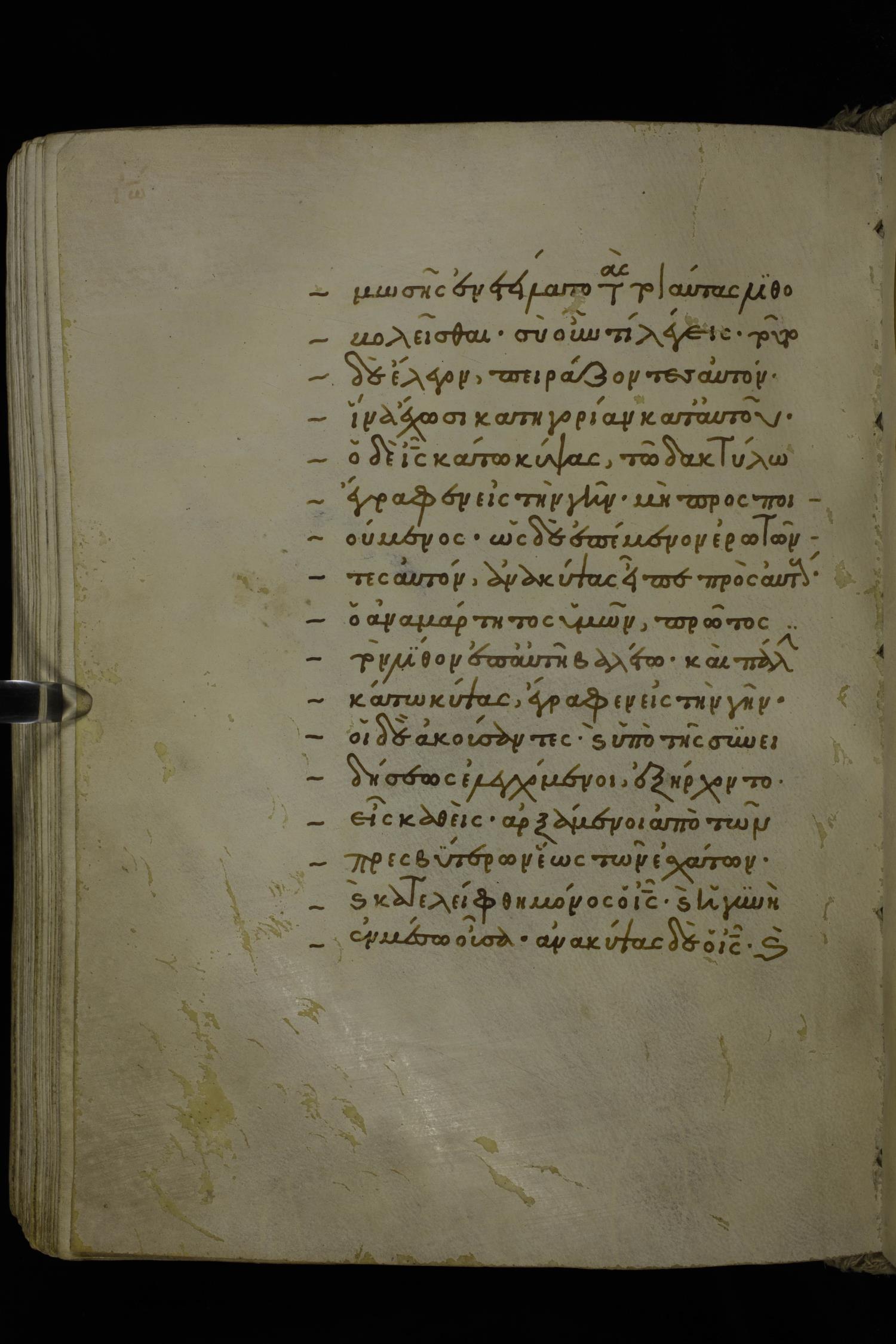 Fifteenth century minuscule (dated to 1418) of the Gospels on parchment; 344 leaves, 1 column, 17 lines per column. Images were taken at the National Library of Greece in Athens.