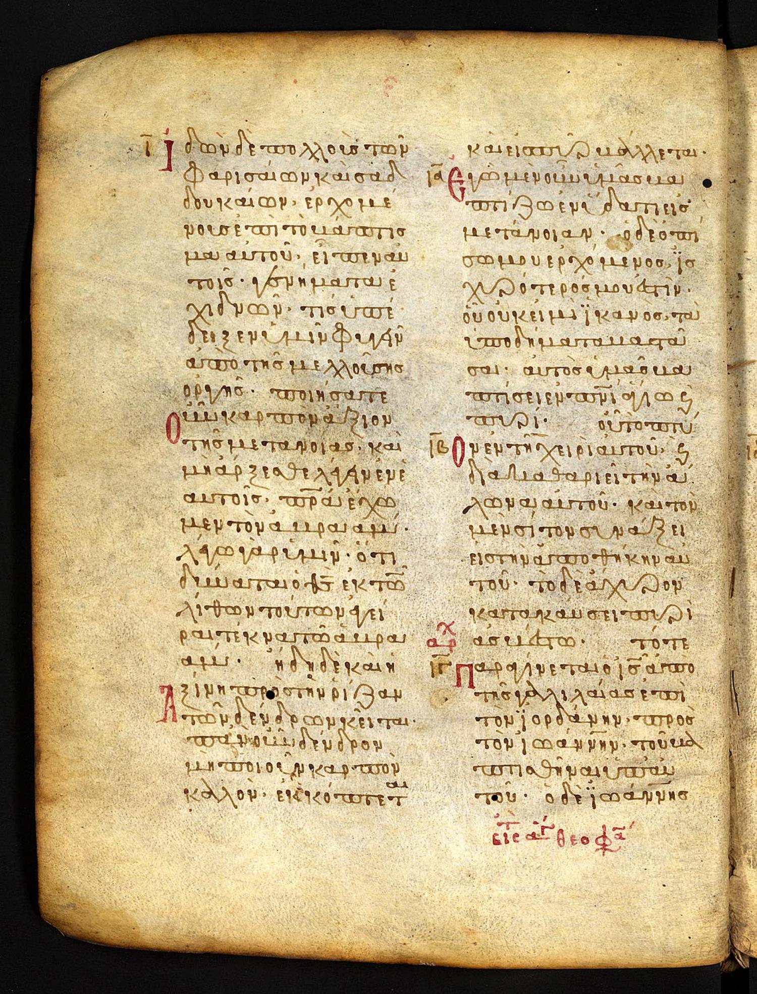 Thirteenth-century (c. 1200) manuscript of the Gospels on parchment; 197 leaves, 2 columns, 25 lines per column. These images are made available by the holding institution according to Creative Commons licensing. For recent digital images, visit Manuscriptorium online.