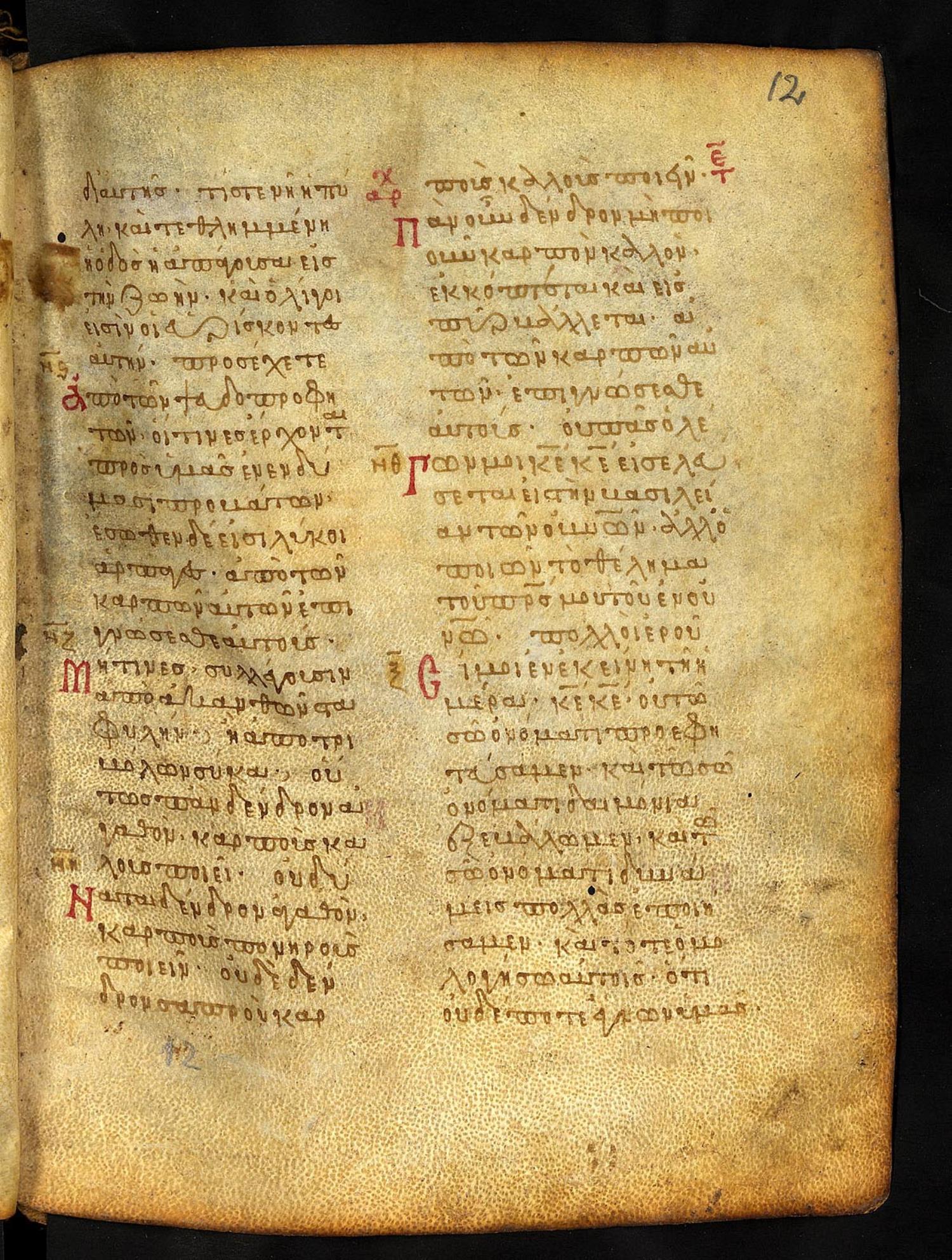 Thirteenth-century (c. 1200) manuscript of the Gospels on parchment; 197 leaves, 2 columns, 25 lines per column. These images are made available by the holding institution according to Creative Commons licensing. For recent digital images, visit Manuscriptorium online.