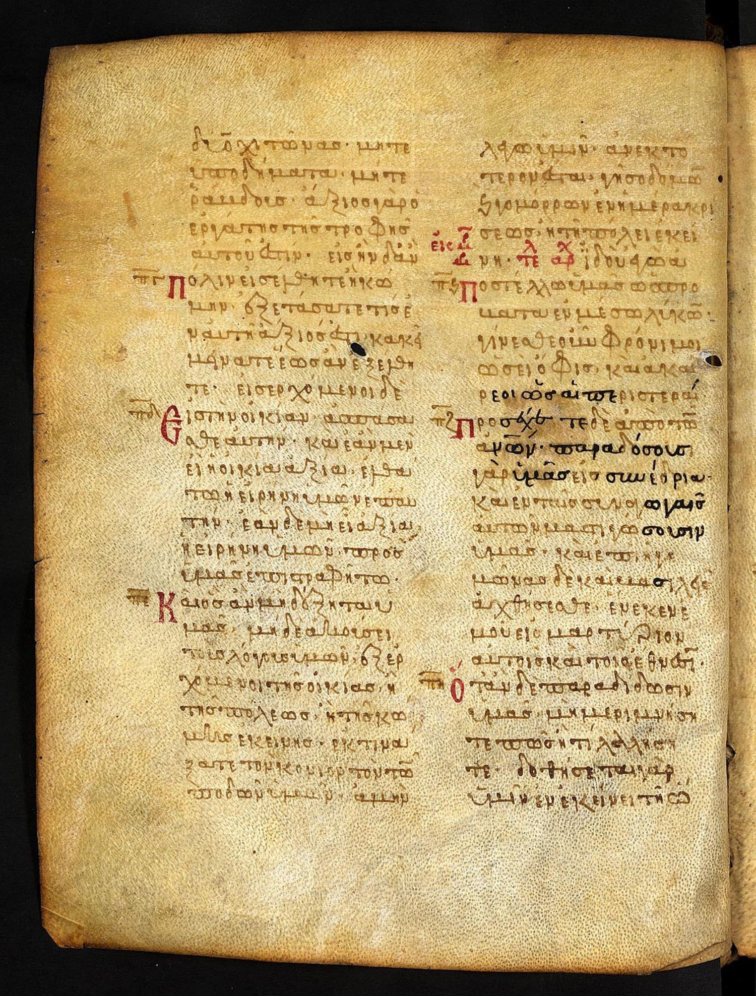 Thirteenth-century (c. 1200) manuscript of the Gospels on parchment; 197 leaves, 2 columns, 25 lines per column. These images are made available by the holding institution according to Creative Commons licensing. For recent digital images, visit Manuscriptorium online.