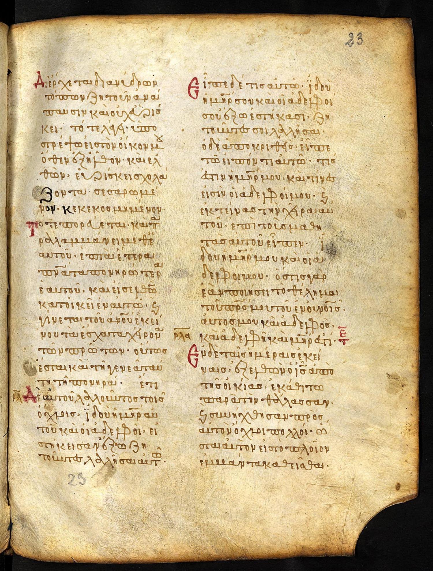 Thirteenth-century (c. 1200) manuscript of the Gospels on parchment; 197 leaves, 2 columns, 25 lines per column. These images are made available by the holding institution according to Creative Commons licensing. For recent digital images, visit Manuscriptorium online.