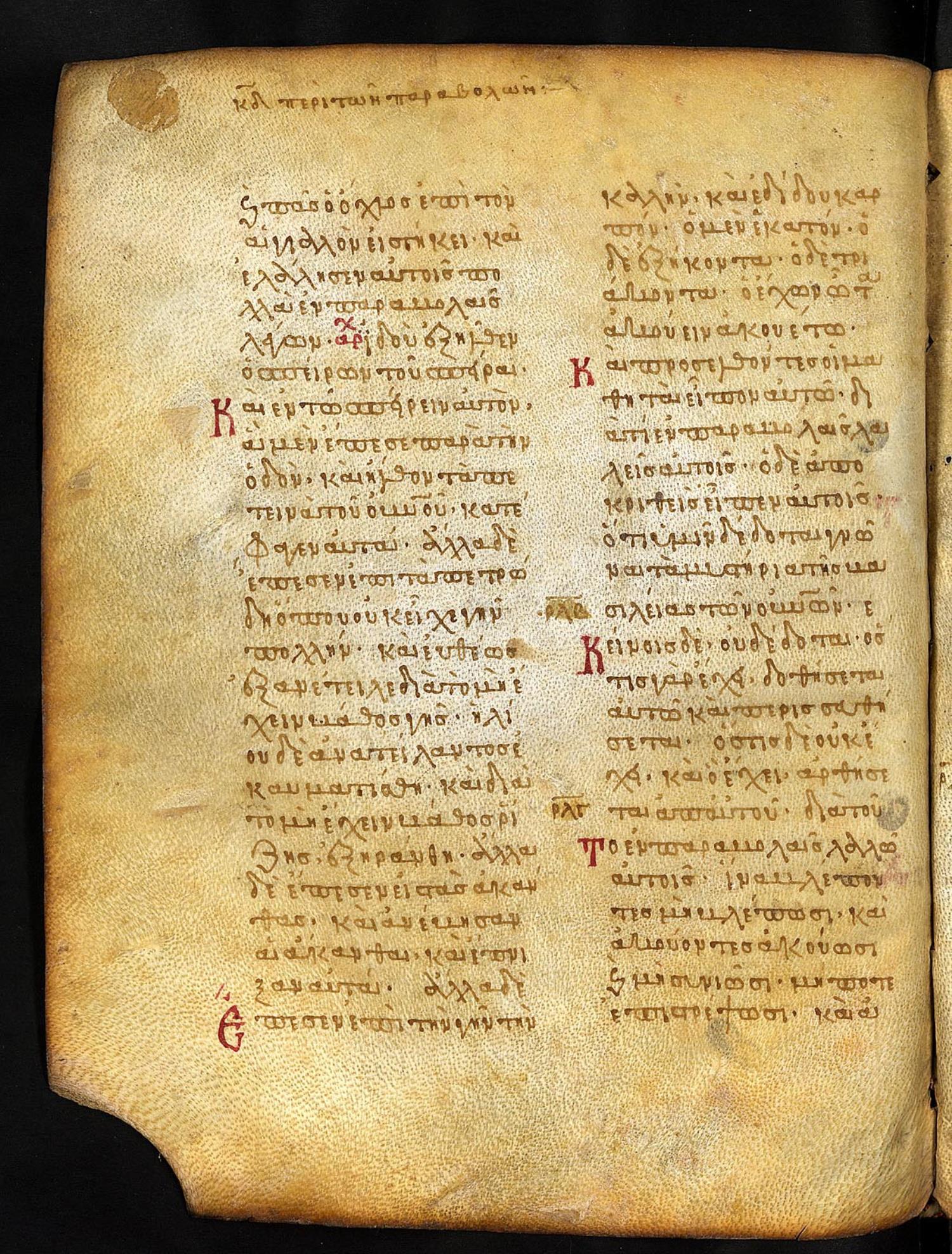 Thirteenth-century (c. 1200) manuscript of the Gospels on parchment; 197 leaves, 2 columns, 25 lines per column. These images are made available by the holding institution according to Creative Commons licensing. For recent digital images, visit Manuscriptorium online.