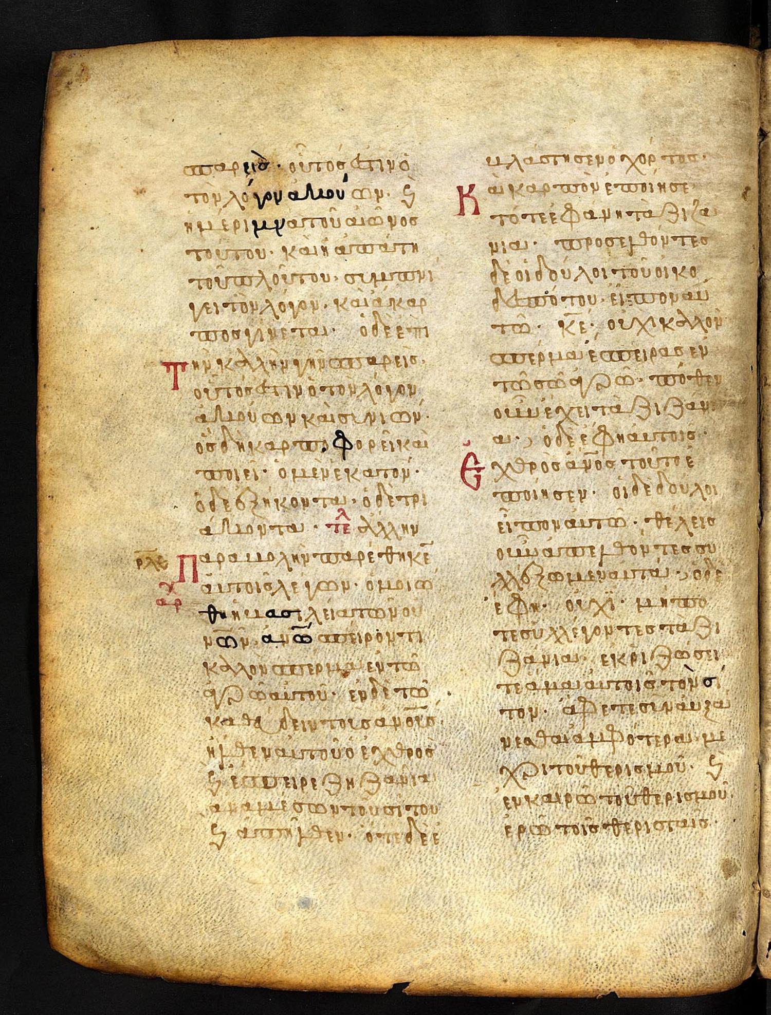 Thirteenth-century (c. 1200) manuscript of the Gospels on parchment; 197 leaves, 2 columns, 25 lines per column. These images are made available by the holding institution according to Creative Commons licensing. For recent digital images, visit Manuscriptorium online.