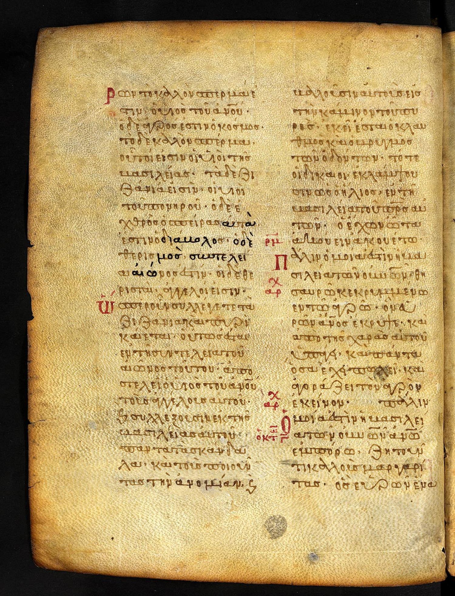 Thirteenth-century (c. 1200) manuscript of the Gospels on parchment; 197 leaves, 2 columns, 25 lines per column. These images are made available by the holding institution according to Creative Commons licensing. For recent digital images, visit Manuscriptorium online.