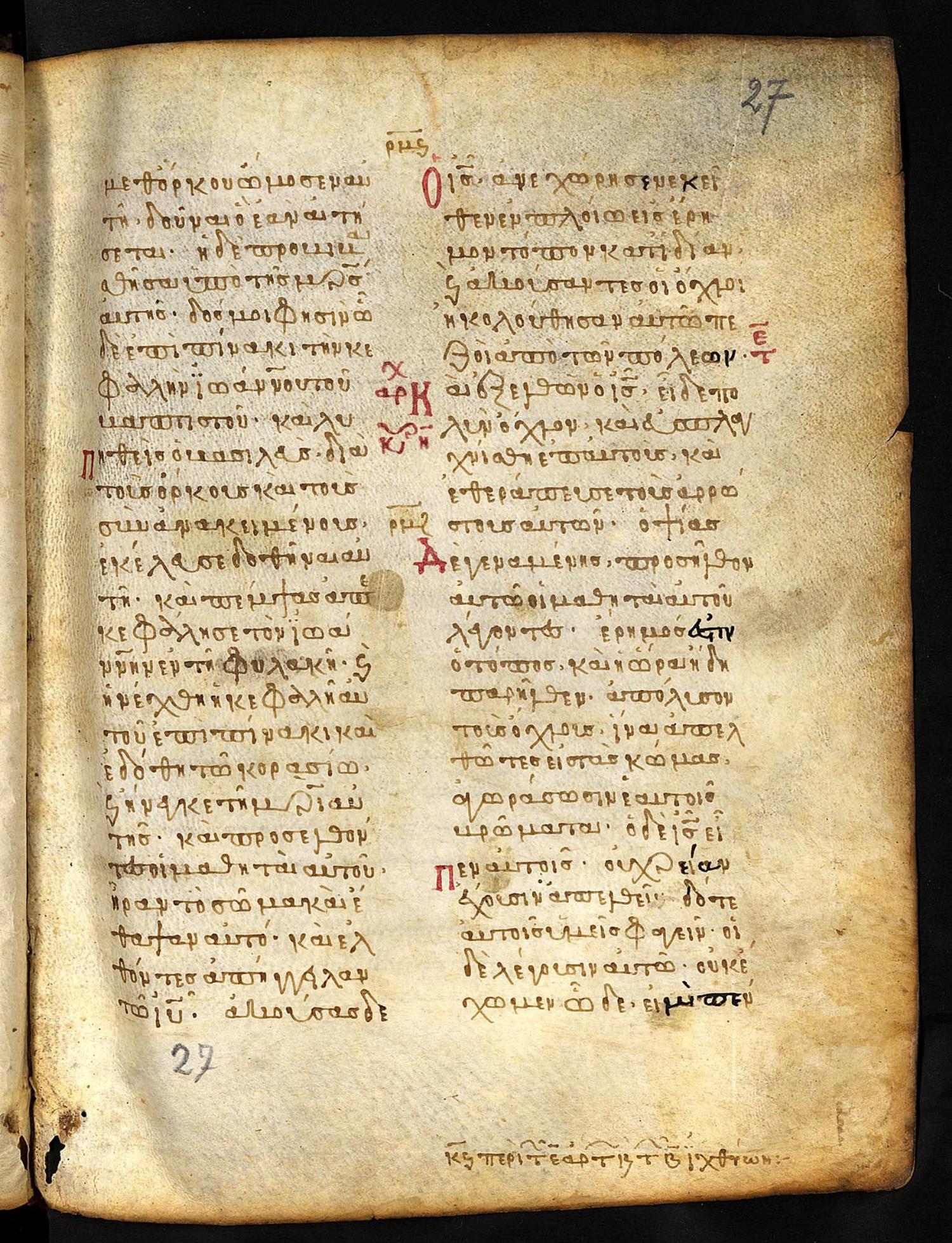 Thirteenth-century (c. 1200) manuscript of the Gospels on parchment; 197 leaves, 2 columns, 25 lines per column. These images are made available by the holding institution according to Creative Commons licensing. For recent digital images, visit Manuscriptorium online.