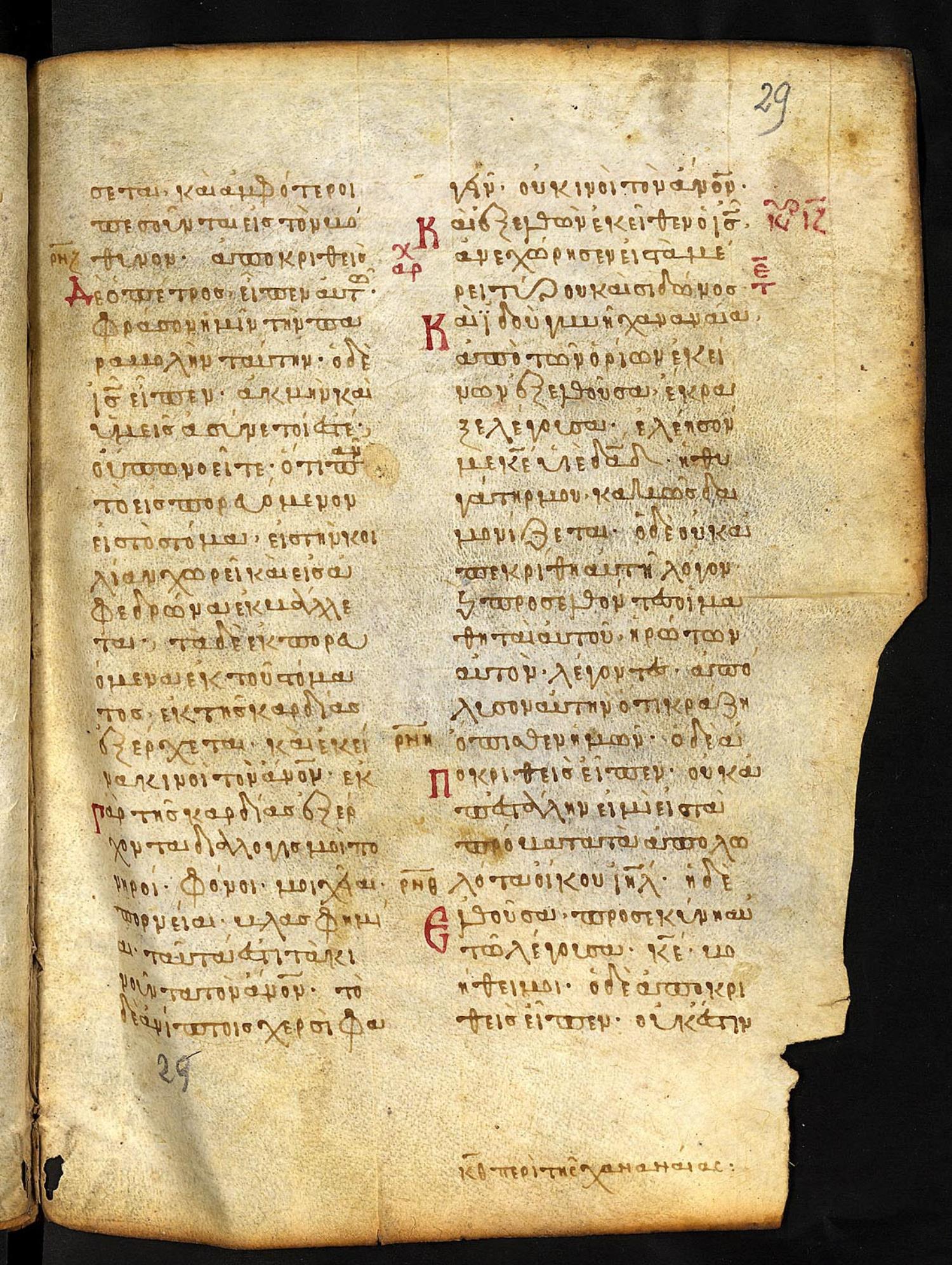 Thirteenth-century (c. 1200) manuscript of the Gospels on parchment; 197 leaves, 2 columns, 25 lines per column. These images are made available by the holding institution according to Creative Commons licensing. For recent digital images, visit Manuscriptorium online.
