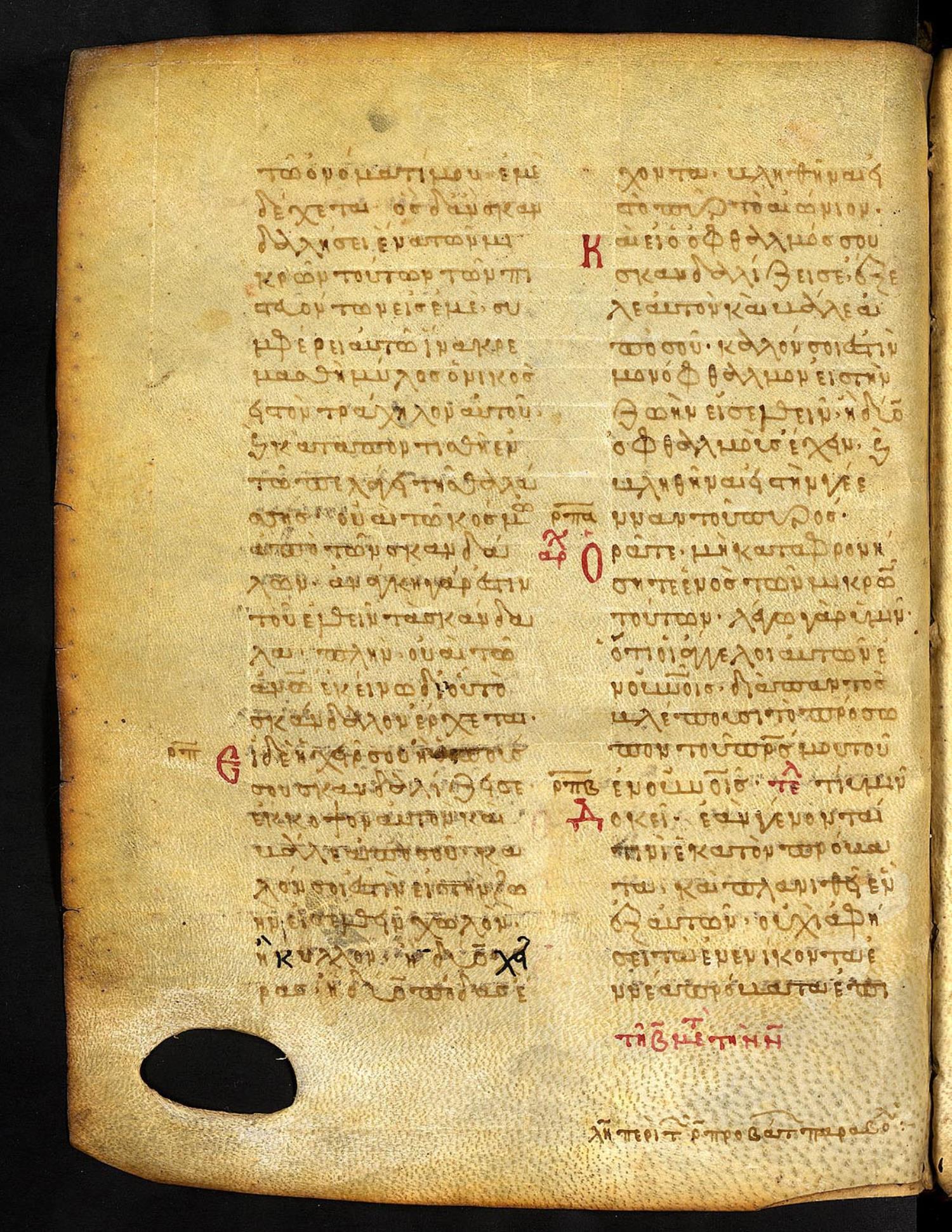 Thirteenth-century (c. 1200) manuscript of the Gospels on parchment; 197 leaves, 2 columns, 25 lines per column. These images are made available by the holding institution according to Creative Commons licensing. For recent digital images, visit Manuscriptorium online.