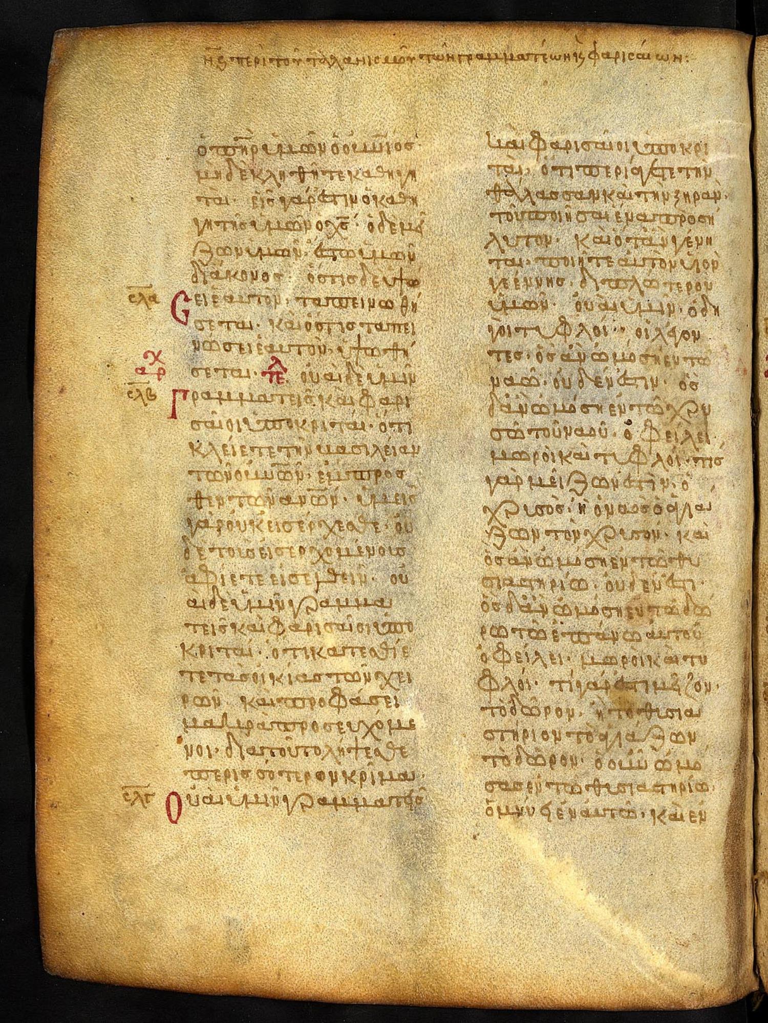 Thirteenth-century (c. 1200) manuscript of the Gospels on parchment; 197 leaves, 2 columns, 25 lines per column. These images are made available by the holding institution according to Creative Commons licensing. For recent digital images, visit Manuscriptorium online.