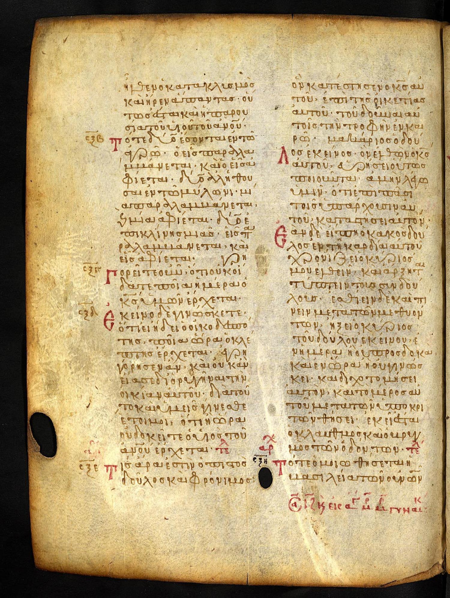 Thirteenth-century (c. 1200) manuscript of the Gospels on parchment; 197 leaves, 2 columns, 25 lines per column. These images are made available by the holding institution according to Creative Commons licensing. For recent digital images, visit Manuscriptorium online.