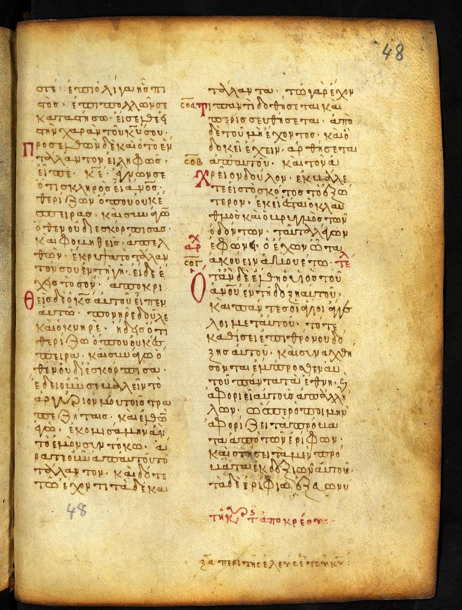 Thirteenth-century (c. 1200) manuscript of the Gospels on parchment; 197 leaves, 2 columns, 25 lines per column. These images are made available by the holding institution according to Creative Commons licensing. For recent digital images, visit Manuscriptorium online.