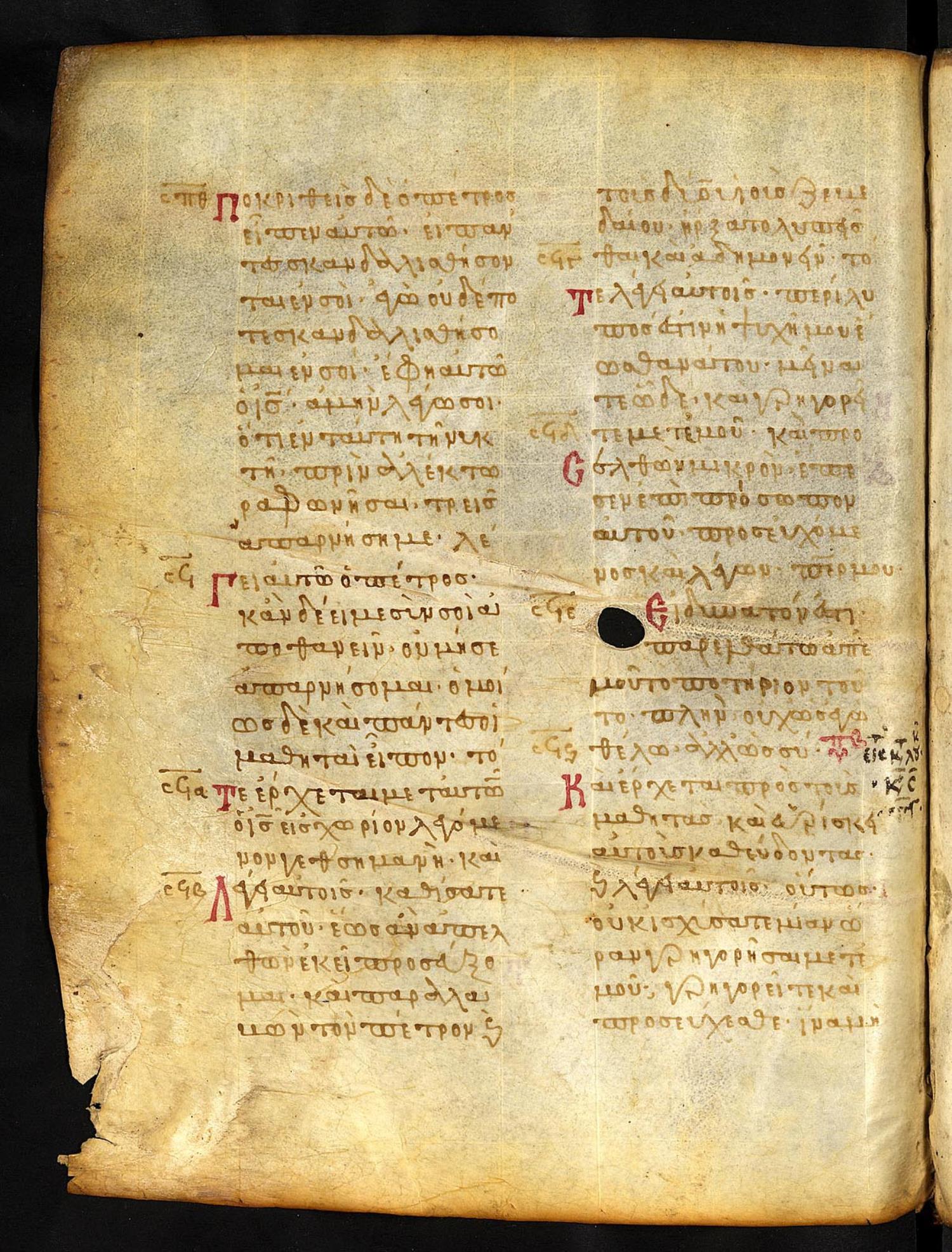 Thirteenth-century (c. 1200) manuscript of the Gospels on parchment; 197 leaves, 2 columns, 25 lines per column. These images are made available by the holding institution according to Creative Commons licensing. For recent digital images, visit Manuscriptorium online.