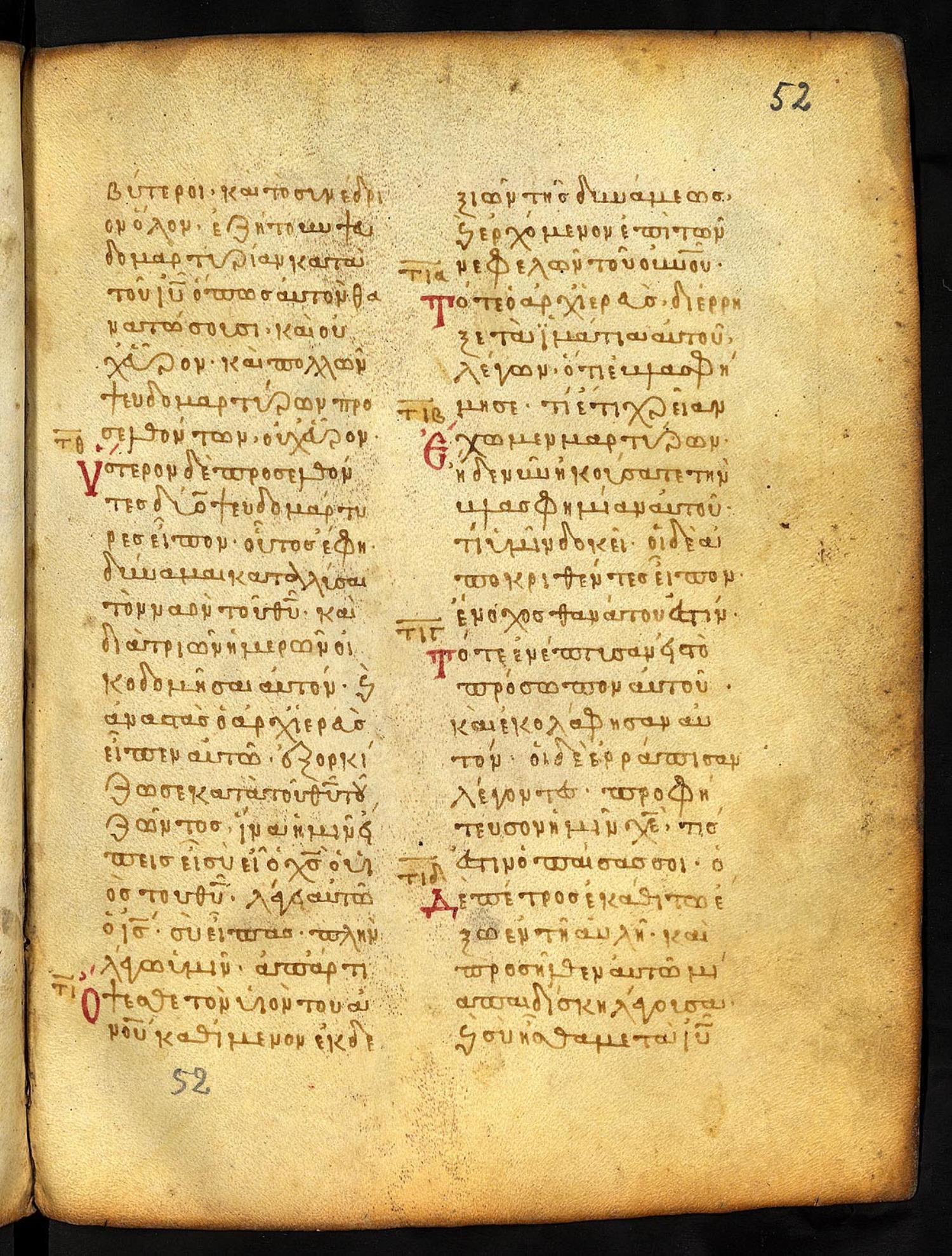 Thirteenth-century (c. 1200) manuscript of the Gospels on parchment; 197 leaves, 2 columns, 25 lines per column. These images are made available by the holding institution according to Creative Commons licensing. For recent digital images, visit Manuscriptorium online.