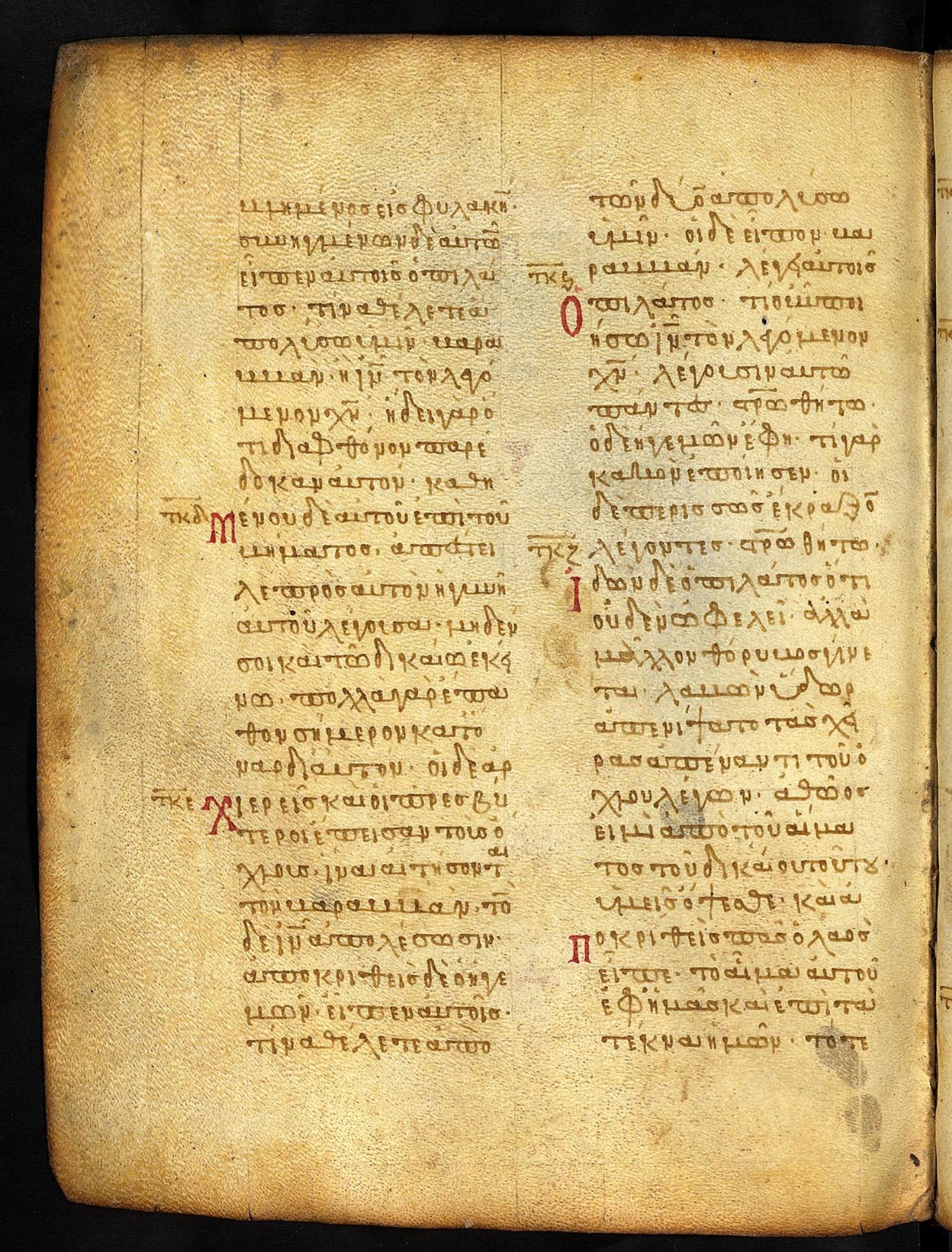 Thirteenth-century (c. 1200) manuscript of the Gospels on parchment; 197 leaves, 2 columns, 25 lines per column. These images are made available by the holding institution according to Creative Commons licensing. For recent digital images, visit Manuscriptorium online.