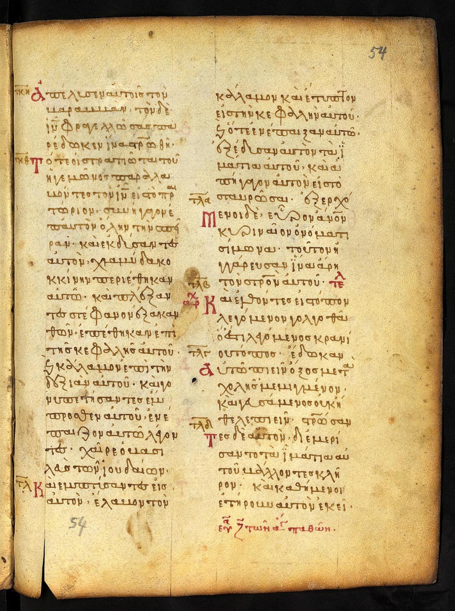 καὶ ἐμπτύσαντες εἰς αὐτὸν ἔλαβον τὸν κάλαμον καὶ ἔτυπτον εἰς τὴν κεφαλὴν αὐτοῦ.