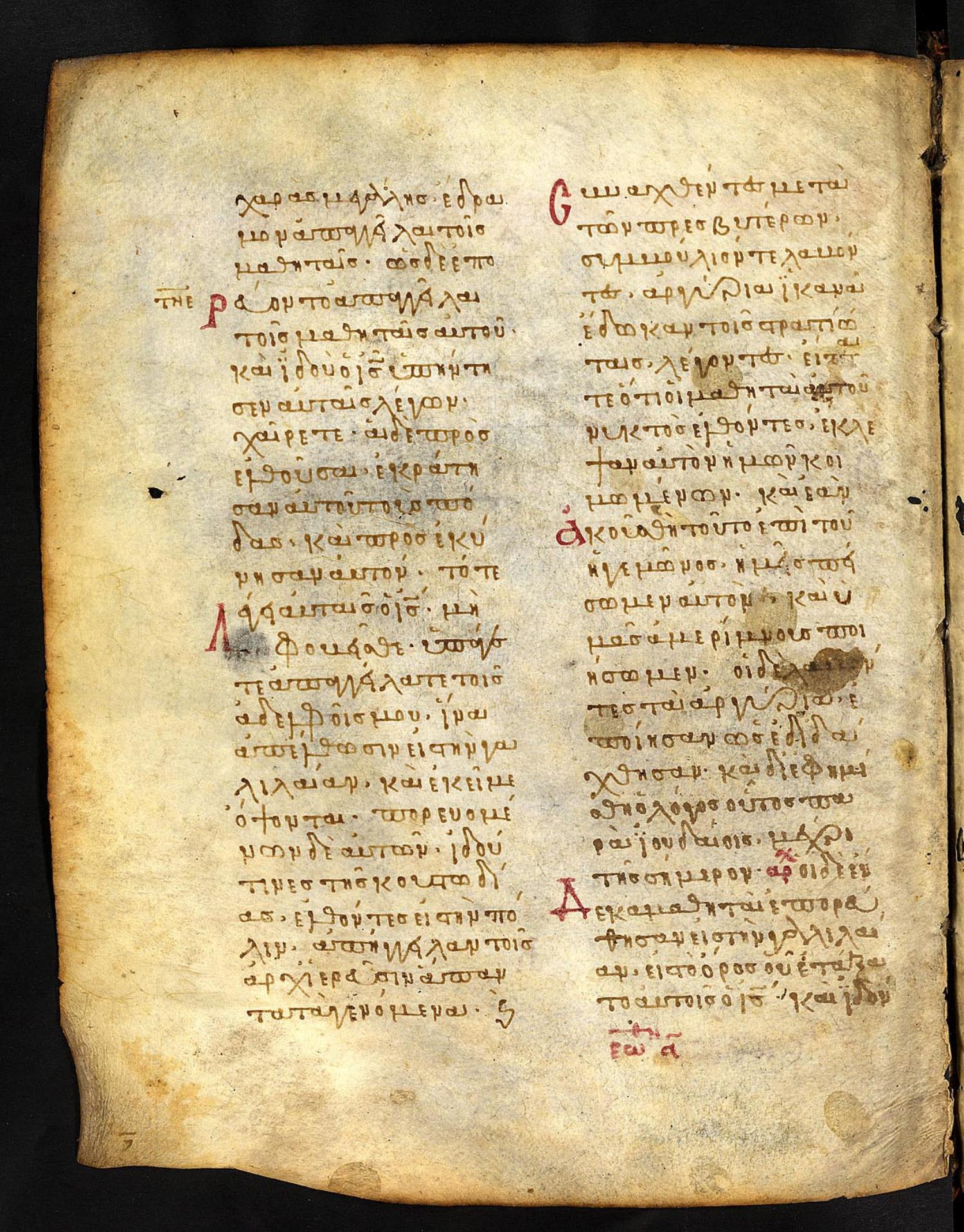 Thirteenth-century (c. 1200) manuscript of the Gospels on parchment; 197 leaves, 2 columns, 25 lines per column. These images are made available by the holding institution according to Creative Commons licensing. For recent digital images, visit Manuscriptorium online.