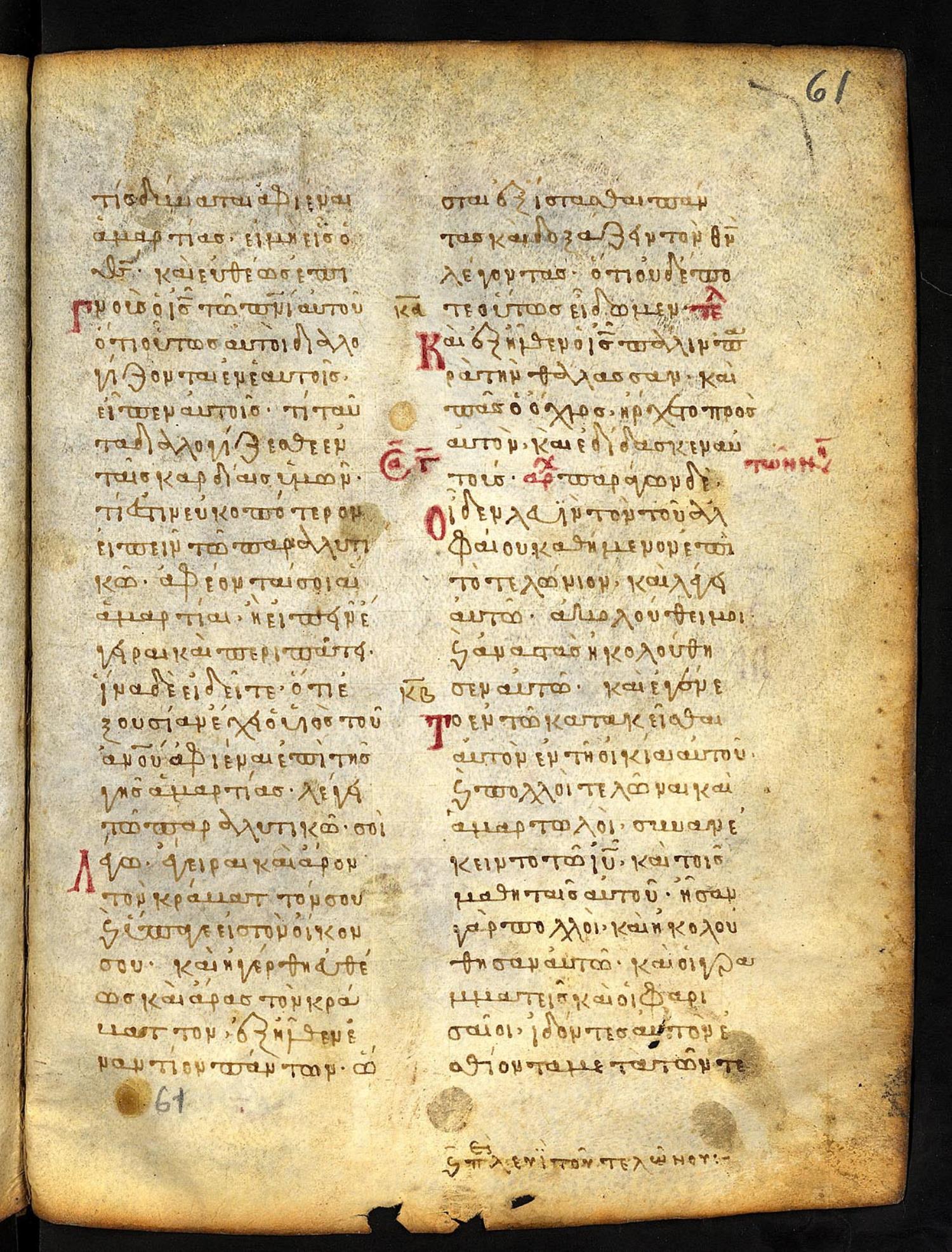 Thirteenth-century (c. 1200) manuscript of the Gospels on parchment; 197 leaves, 2 columns, 25 lines per column. These images are made available by the holding institution according to Creative Commons licensing. For recent digital images, visit Manuscriptorium online.