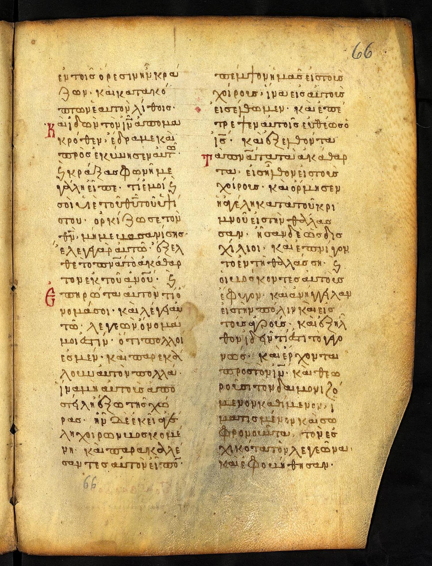 Thirteenth-century (c. 1200) manuscript of the Gospels on parchment; 197 leaves, 2 columns, 25 lines per column. These images are made available by the holding institution according to Creative Commons licensing. For recent digital images, visit Manuscriptorium online.