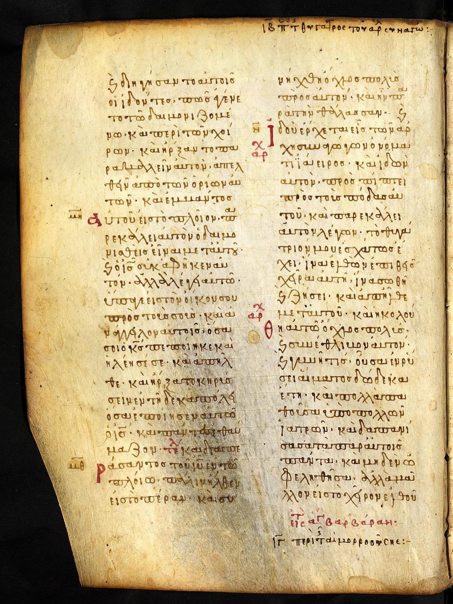 Thirteenth-century (c. 1200) manuscript of the Gospels on parchment; 197 leaves, 2 columns, 25 lines per column. These images are made available by the holding institution according to Creative Commons licensing. For recent digital images, visit Manuscriptorium online.