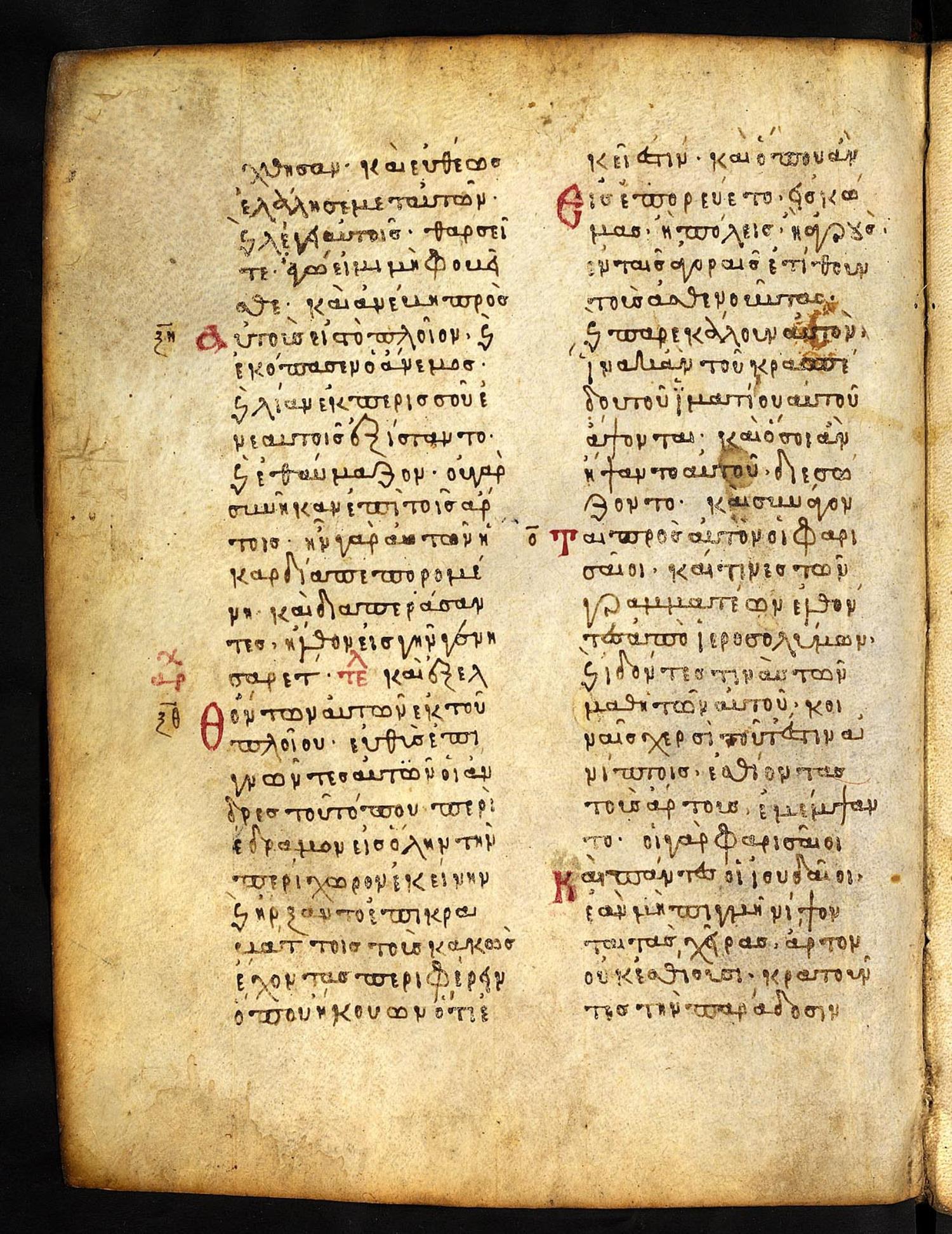 Thirteenth-century (c. 1200) manuscript of the Gospels on parchment; 197 leaves, 2 columns, 25 lines per column. These images are made available by the holding institution according to Creative Commons licensing. For recent digital images, visit Manuscriptorium online.