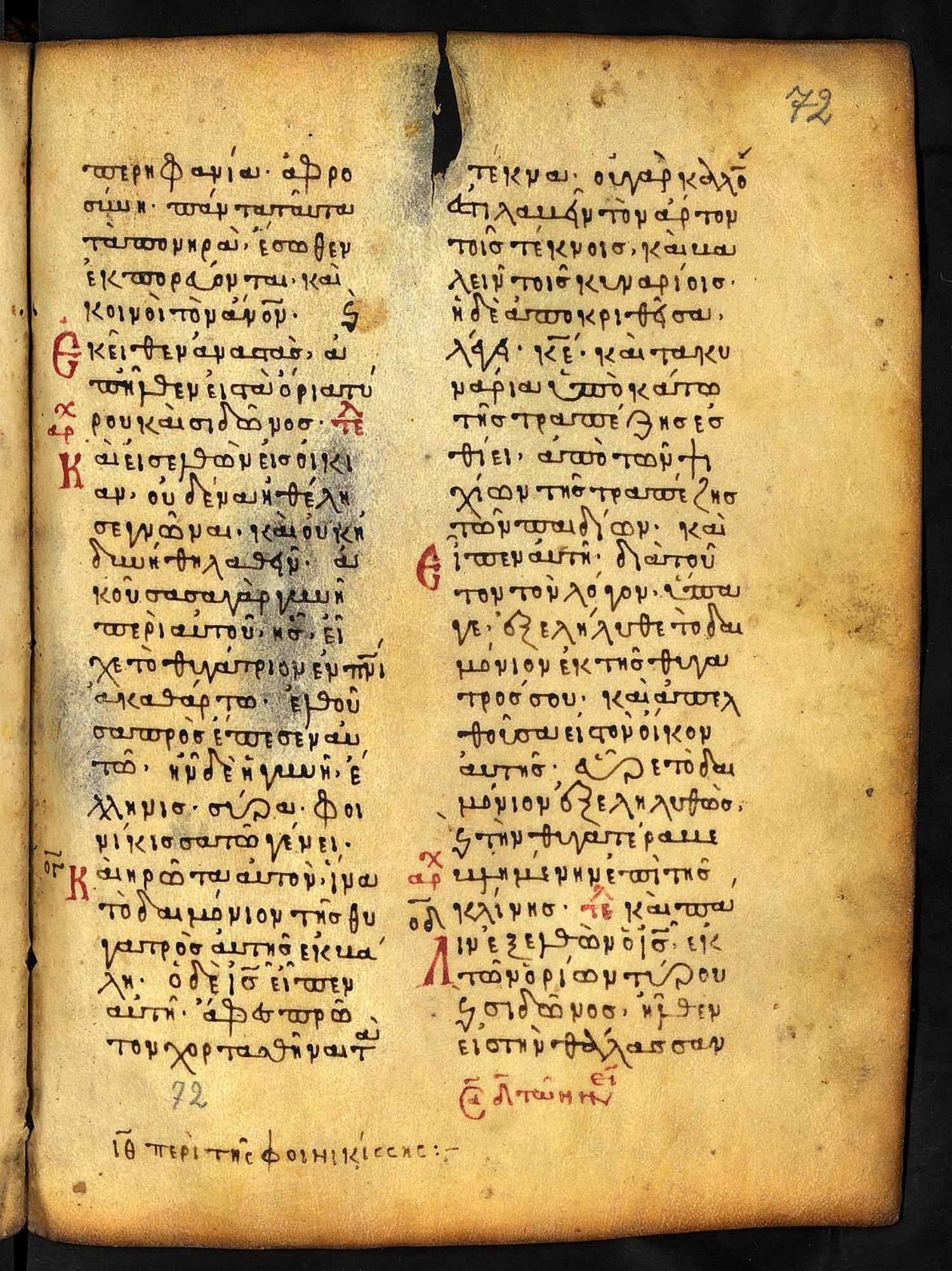 Thirteenth-century (c. 1200) manuscript of the Gospels on parchment; 197 leaves, 2 columns, 25 lines per column. These images are made available by the holding institution according to Creative Commons licensing. For recent digital images, visit Manuscriptorium online.