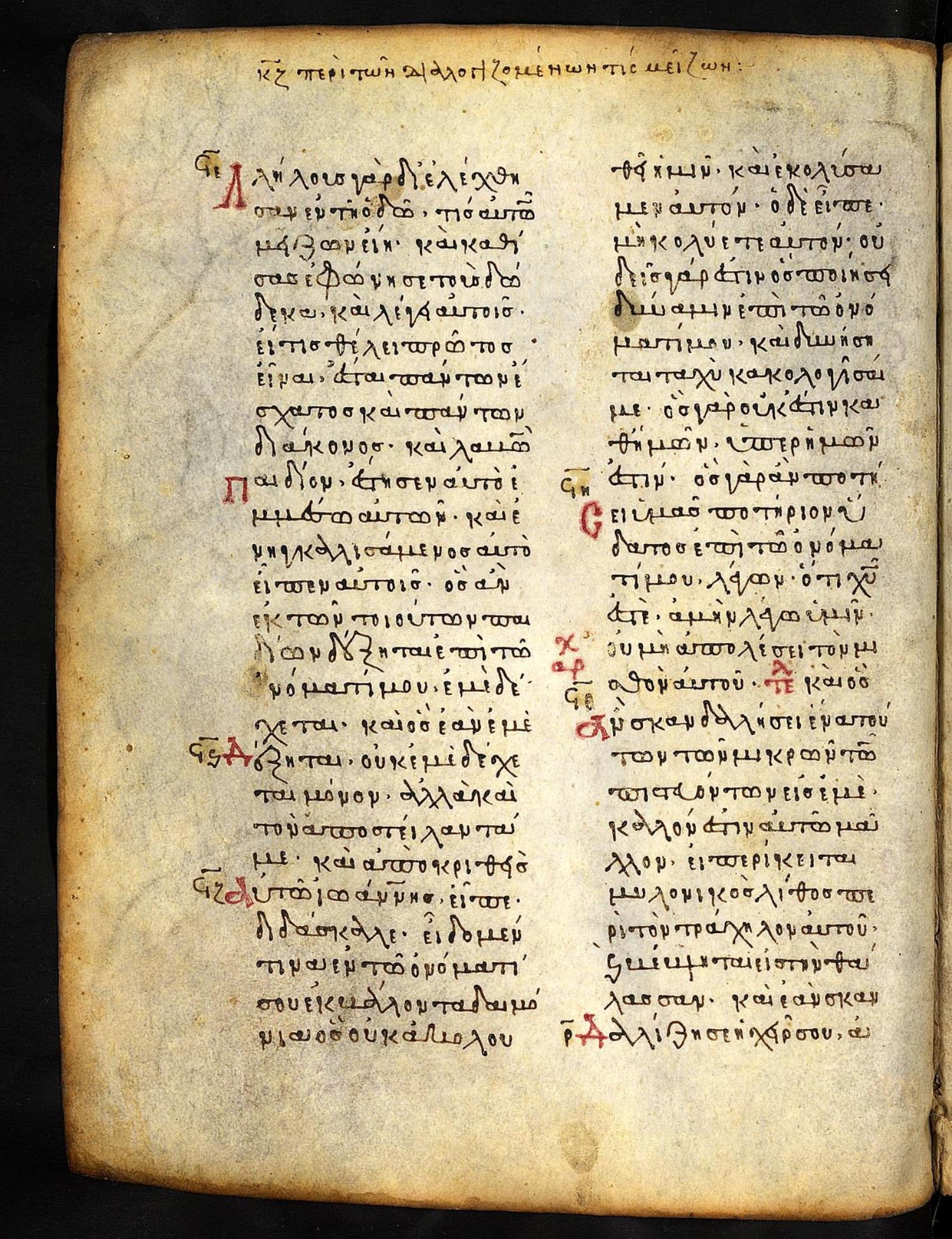 Thirteenth-century (c. 1200) manuscript of the Gospels on parchment; 197 leaves, 2 columns, 25 lines per column. These images are made available by the holding institution according to Creative Commons licensing. For recent digital images, visit Manuscriptorium online.