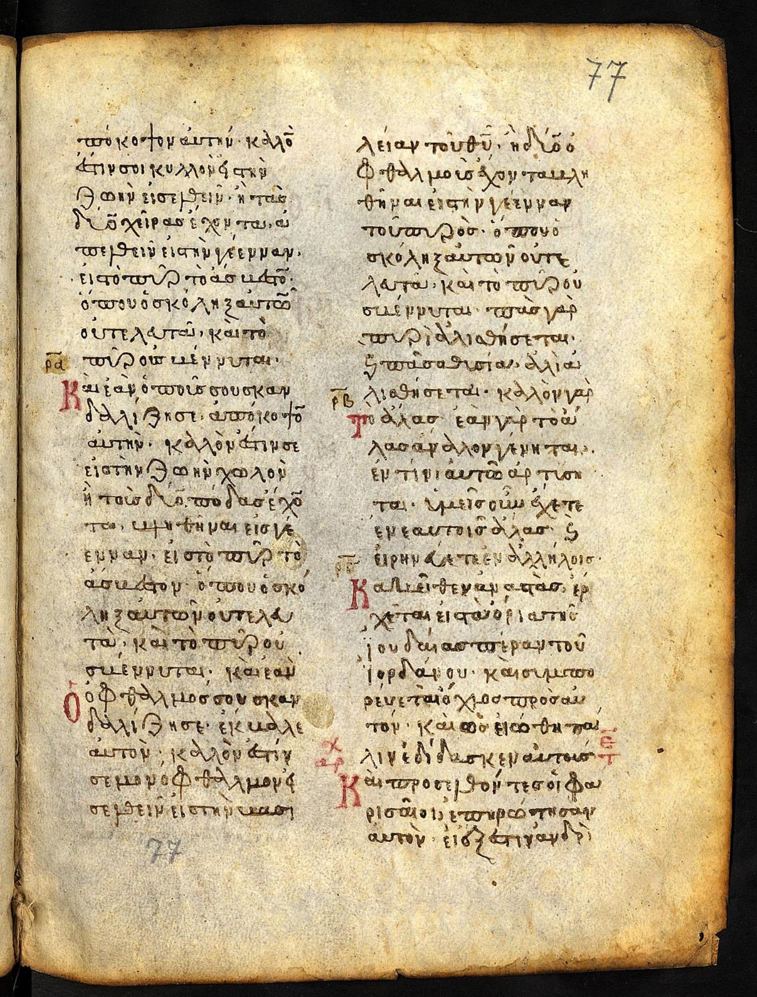 Thirteenth-century (c. 1200) manuscript of the Gospels on parchment; 197 leaves, 2 columns, 25 lines per column. These images are made available by the holding institution according to Creative Commons licensing. For recent digital images, visit Manuscriptorium online.