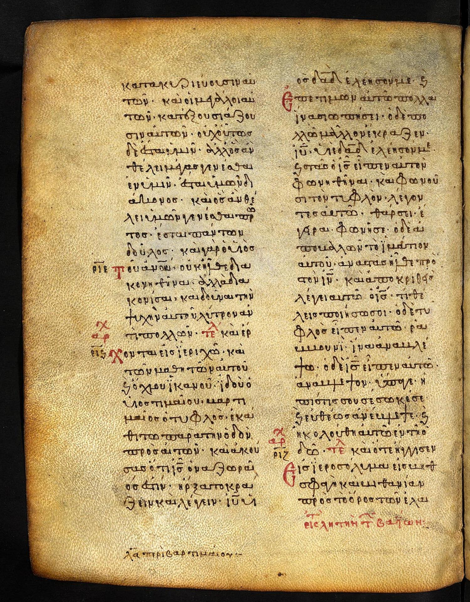 Thirteenth-century (c. 1200) manuscript of the Gospels on parchment; 197 leaves, 2 columns, 25 lines per column. These images are made available by the holding institution according to Creative Commons licensing. For recent digital images, visit Manuscriptorium online.