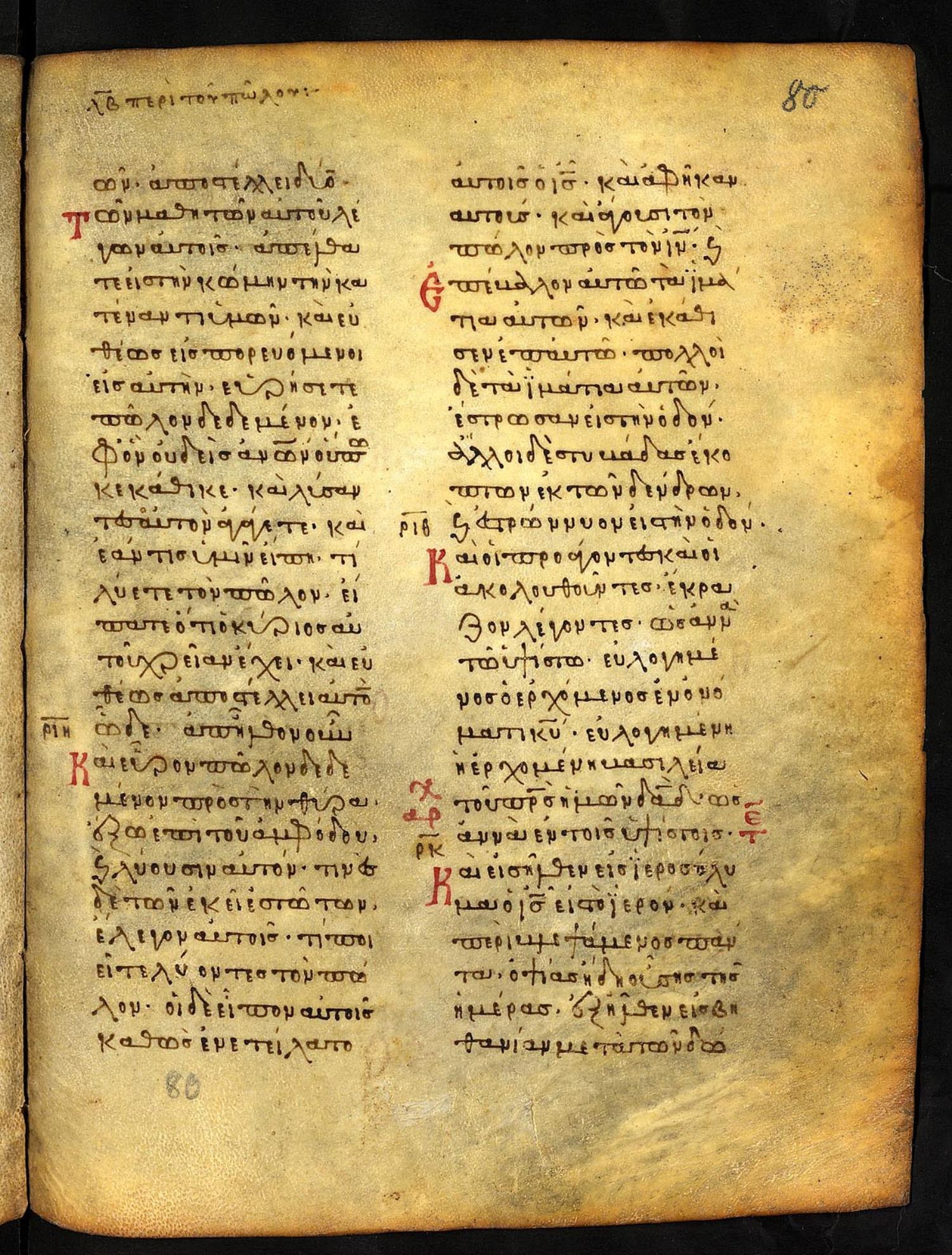 Thirteenth-century (c. 1200) manuscript of the Gospels on parchment; 197 leaves, 2 columns, 25 lines per column. These images are made available by the holding institution according to Creative Commons licensing. For recent digital images, visit Manuscriptorium online.