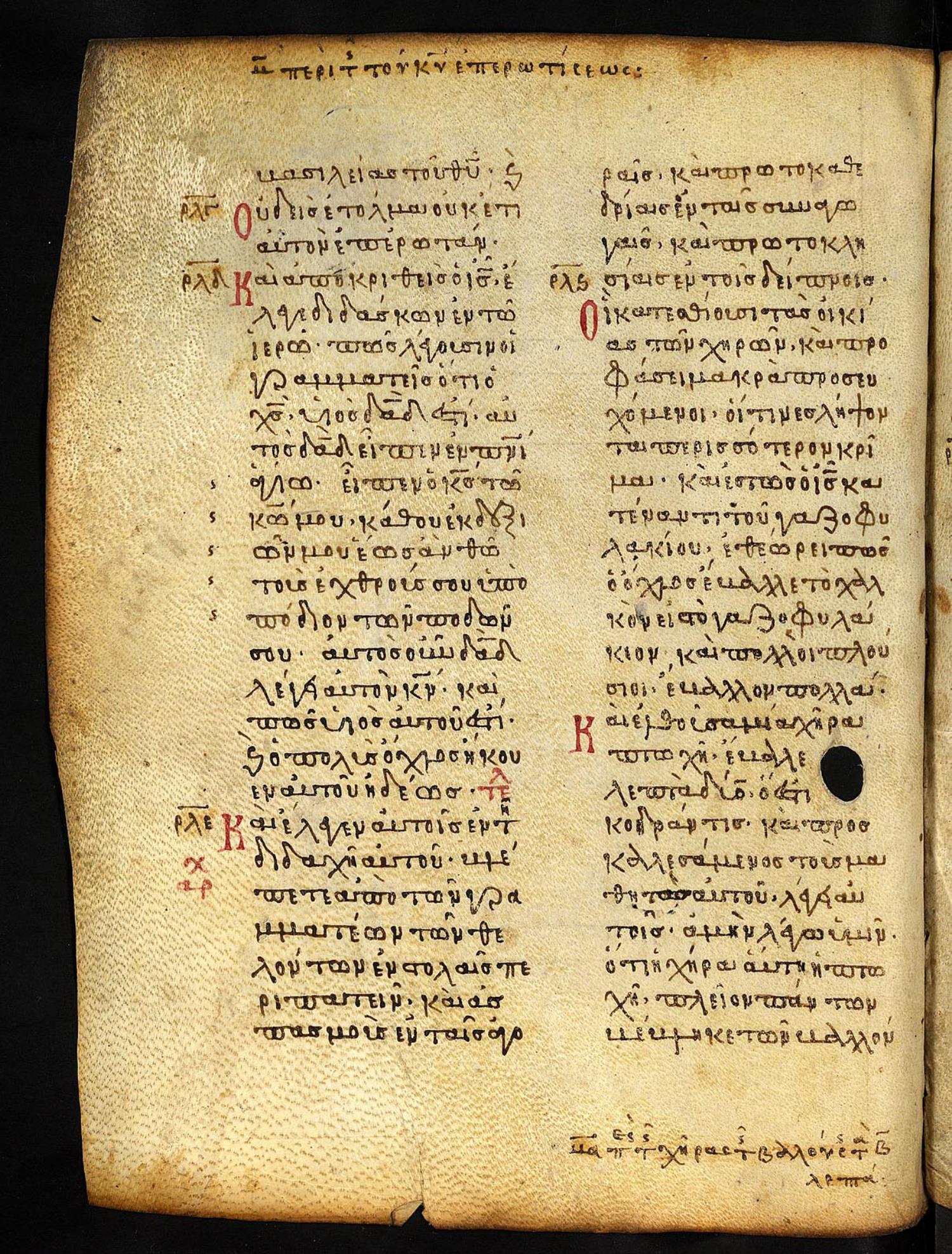 Thirteenth-century (c. 1200) manuscript of the Gospels on parchment; 197 leaves, 2 columns, 25 lines per column. These images are made available by the holding institution according to Creative Commons licensing. For recent digital images, visit Manuscriptorium online.