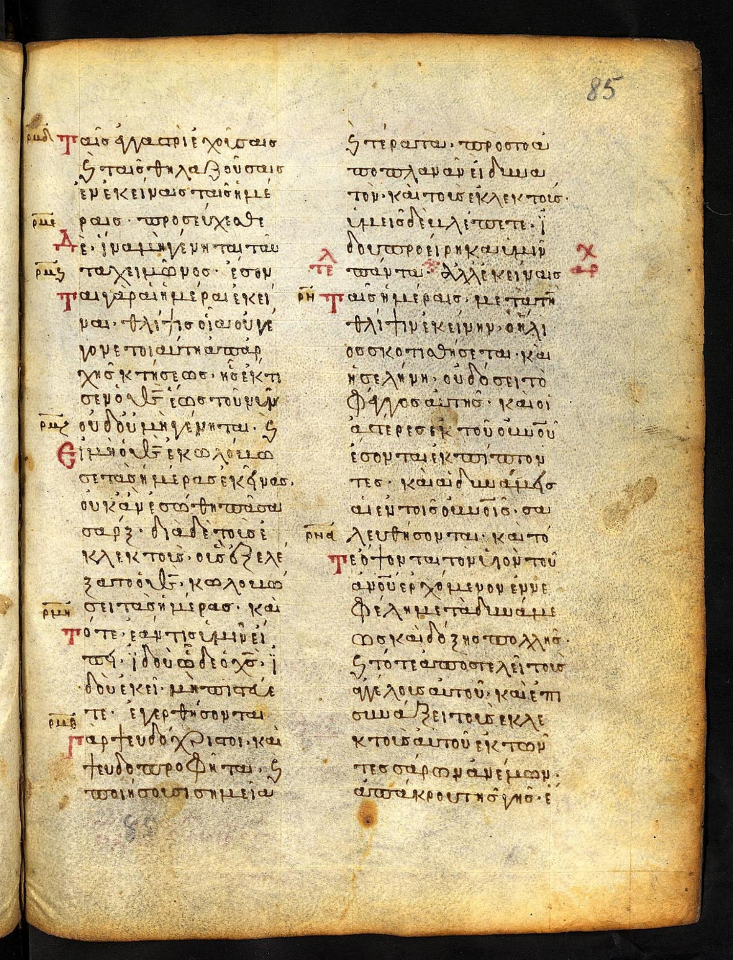 Thirteenth-century (c. 1200) manuscript of the Gospels on parchment; 197 leaves, 2 columns, 25 lines per column. These images are made available by the holding institution according to Creative Commons licensing. For recent digital images, visit Manuscriptorium online.