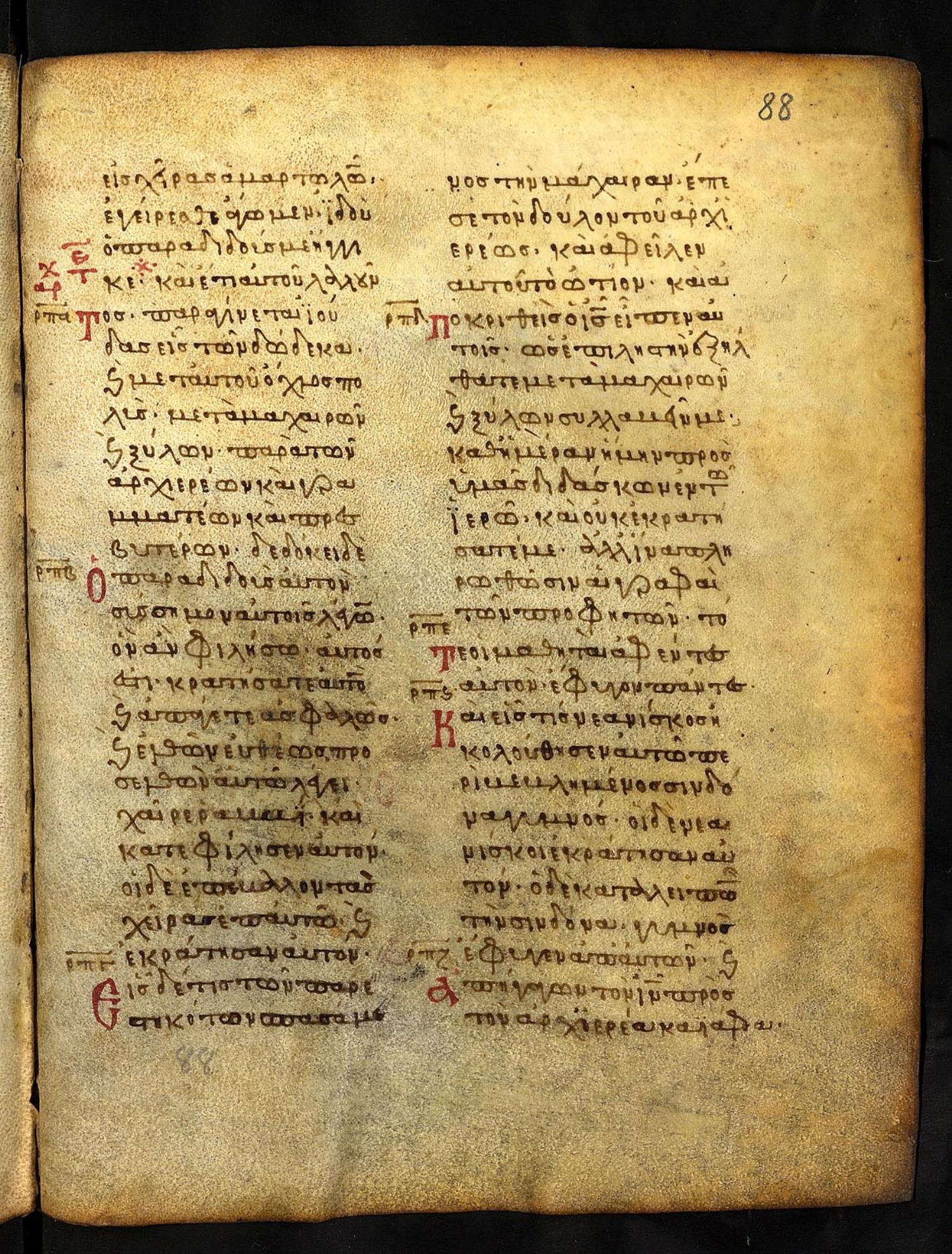 Thirteenth-century (c. 1200) manuscript of the Gospels on parchment; 197 leaves, 2 columns, 25 lines per column. These images are made available by the holding institution according to Creative Commons licensing. For recent digital images, visit Manuscriptorium online.