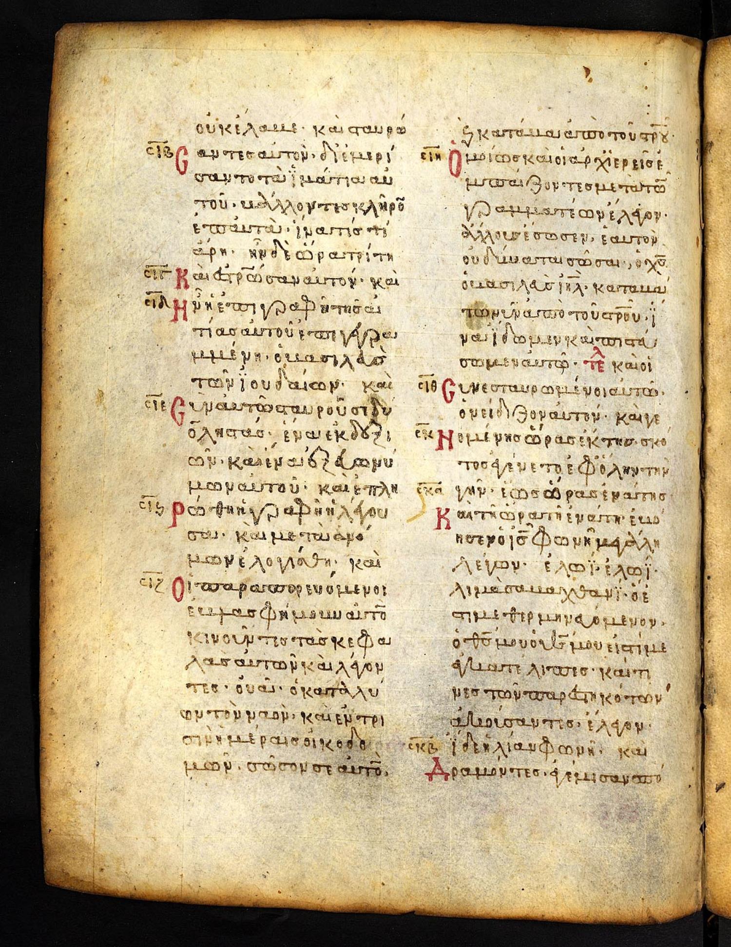Thirteenth-century (c. 1200) manuscript of the Gospels on parchment; 197 leaves, 2 columns, 25 lines per column. These images are made available by the holding institution according to Creative Commons licensing. For recent digital images, visit Manuscriptorium online.