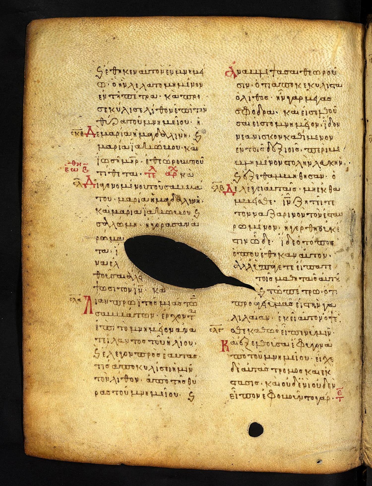 Thirteenth-century (c. 1200) manuscript of the Gospels on parchment; 197 leaves, 2 columns, 25 lines per column. These images are made available by the holding institution according to Creative Commons licensing. For recent digital images, visit Manuscriptorium online.