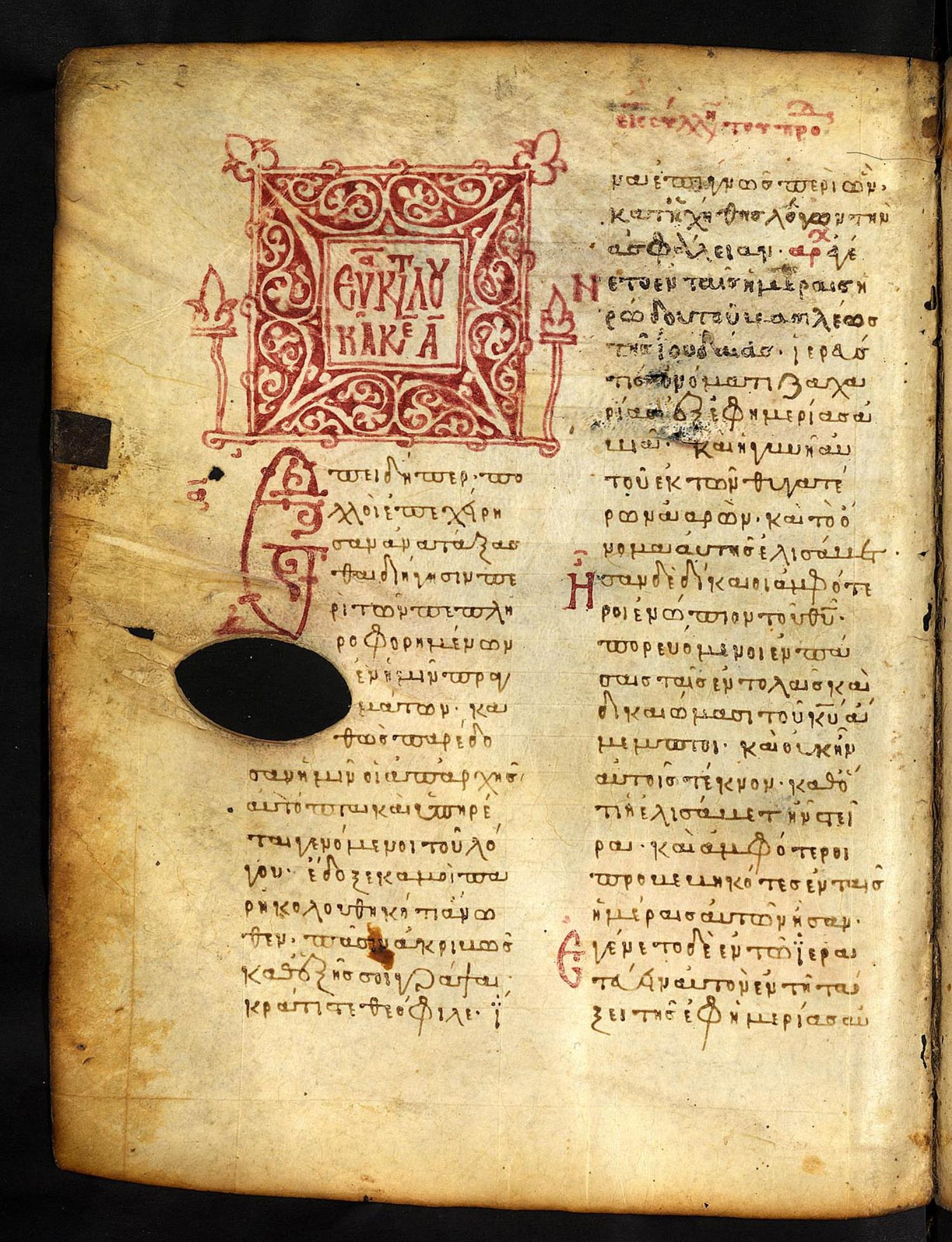 Thirteenth-century (c. 1200) manuscript of the Gospels on parchment; 197 leaves, 2 columns, 25 lines per column. These images are made available by the holding institution according to Creative Commons licensing. For recent digital images, visit Manuscriptorium online.