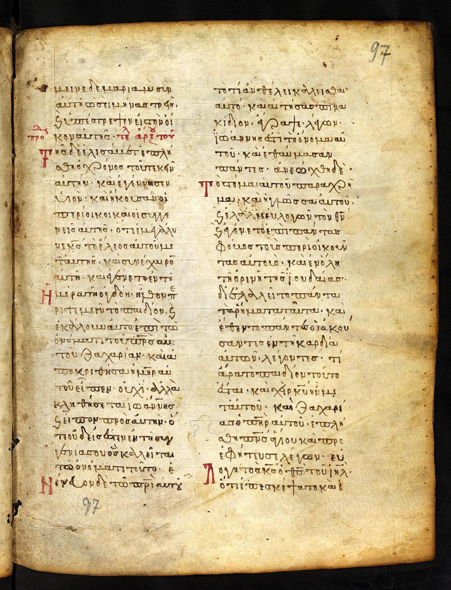 Thirteenth-century (c. 1200) manuscript of the Gospels on parchment; 197 leaves, 2 columns, 25 lines per column. These images are made available by the holding institution according to Creative Commons licensing. For recent digital images, visit Manuscriptorium online.