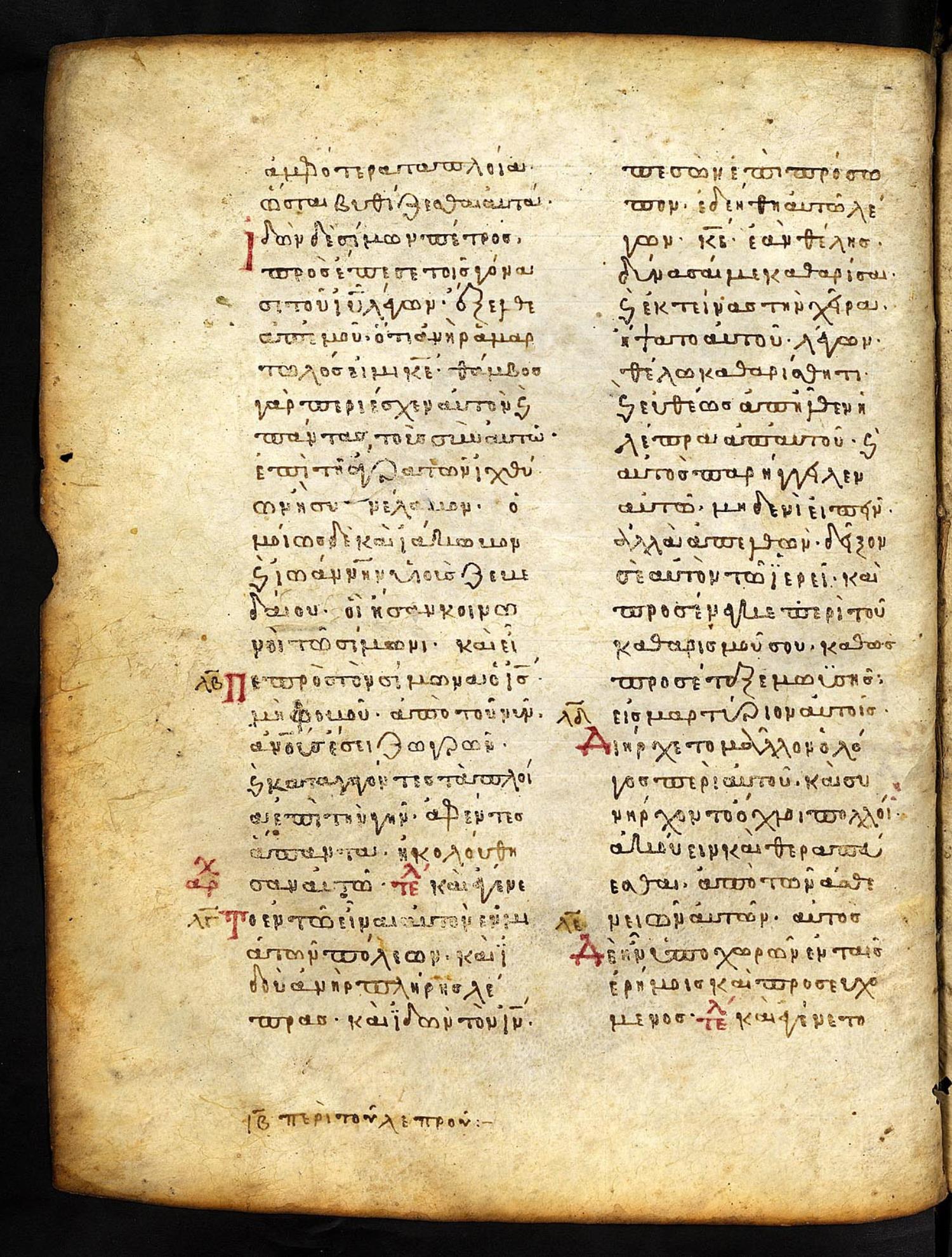 Thirteenth-century (c. 1200) manuscript of the Gospels on parchment; 197 leaves, 2 columns, 25 lines per column. These images are made available by the holding institution according to Creative Commons licensing. For recent digital images, visit Manuscriptorium online.