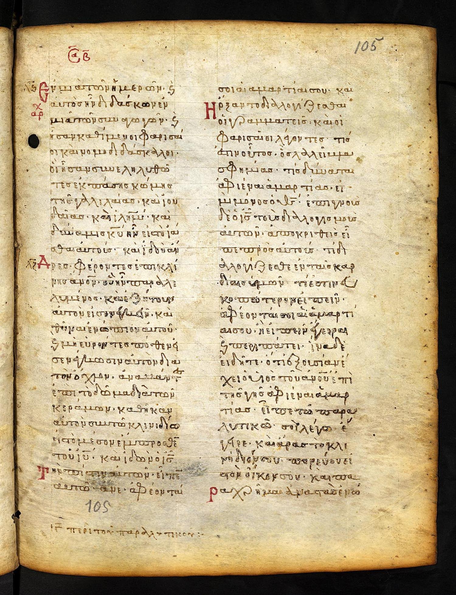 Thirteenth-century (c. 1200) manuscript of the Gospels on parchment; 197 leaves, 2 columns, 25 lines per column. These images are made available by the holding institution according to Creative Commons licensing. For recent digital images, visit Manuscriptorium online.